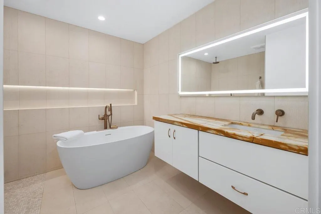 Stunning Carlsbad Coastal Oasis Short walk to North San Diego Countys Premier Beach! A major renovation in 2024, this extraordinary home has been completely reenvisioned and rebuilt from the foundation up, blending timeless craftsmanship with modern luxury. Every inch reflects perfection, featuring exclusive natural wood and stone finishes throughout. Spanning nearly 2,000 square feet, this retreat offers three generously sized bedroom suites, cutting-edge copper plumbing, fully rewired and upgraded electrical systems, and a flawless Level 4 drywall finish for a refined aesthetic. Elegance meets function with wall-to-wall European Oak hardwood flooring, custom cobalt blue solid-box kitchen cabinetry with self-closing hardware, sleek Samsung stainless steel appliances, and luxurious Italian marble countertops. The second floor boasts two expansive primary suites, each with private decks, walk-in closets, and spa-inspired wet baths adorned with Brazilian marble and LED-lit mirrors. Brizo Luxe Gold plumbing fixures used throughout. The third floor offers versatile space complete with a full luxury bathroom, perfect as a private office, fitness area, or a third ensuite bedroom. Nestled in the resort-like Windsong community, enjoy a pool, spa, barbecue area, and lush tropical landscaping, with roofs replaced in 2020. Located in the vibrant coastal village of Carlsbad, this home is moments from pristine beaches, top-tier shopping, and dining, with easy access to the I-5 corridor. Ideal location to enjoy the outdoors. Check attachments for a complete rundown of high-end features