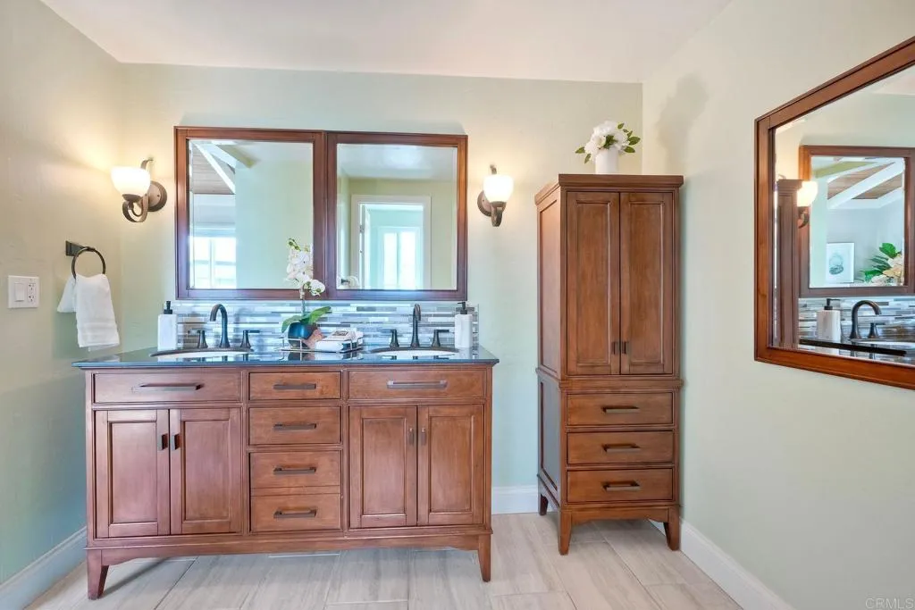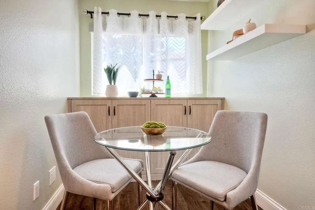 Peace. Privacy. Perfection. Location and privacy are key in this highly sought-after, duplex-style, end unit that shares only one wall. This upscale coastal charmer offers the feel of a private home in a beautifully landscaped community to enjoy expansive greenbelts perfect for morning walks, outdoor relaxation, or simply taking in the serene surroundings. This upgraded beauty features on-trend finishes. Vaulted ceilings with exposed beams, and natural light from the numerous windows that create a farmhouse design style with an open and airy feel. Beautifully remodeled eat-in kitchen with shaker style, soft close cabinets and light, neutral quartz countertops that extend from the kitchen into the dining area with ample storage. Step into your secluded front patio, thoughtfully designed to ensure privacy with no direct views of neighboring units. Inside, you'll find countless high-end upgrades throughout: Dual-pane windows & sliding doors (select sliders tinted for added privacy), Motorized blinds and solar shadesconveniently remote-operated, Custom closets with built-in drawers and cabinetry, Durable vinyl plank flooring in main living areas, plus new carpet in the primary bedroom and stairs, Tiled fireplace with wood mantle and custom cabinet-style screen (gas), Ceiling fans in both bedrooms and the living room, Stylish tile flooring and updated tiled enclosures in both bathrooms.Stay comfortable year-round with a NEW modern, energy-efficient HVAC system. A/C fully updated in July 2024. The spacious two-car garage has been upgraded with epoxy floors, insulated steel door,