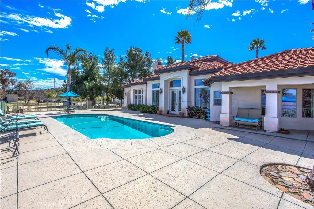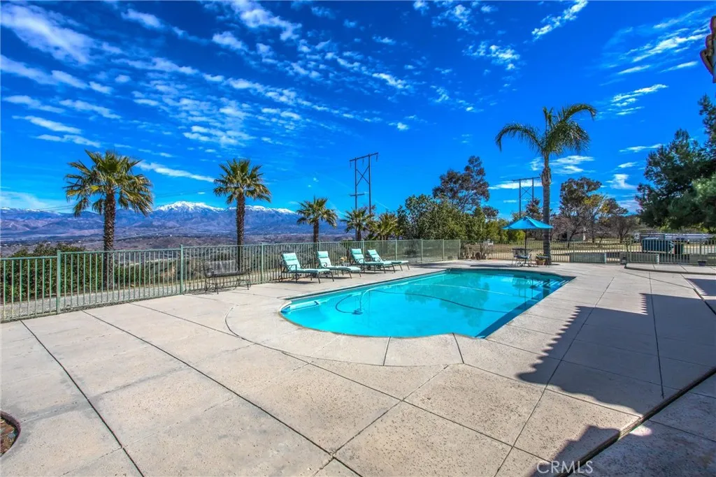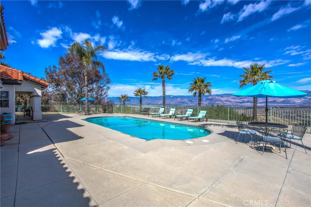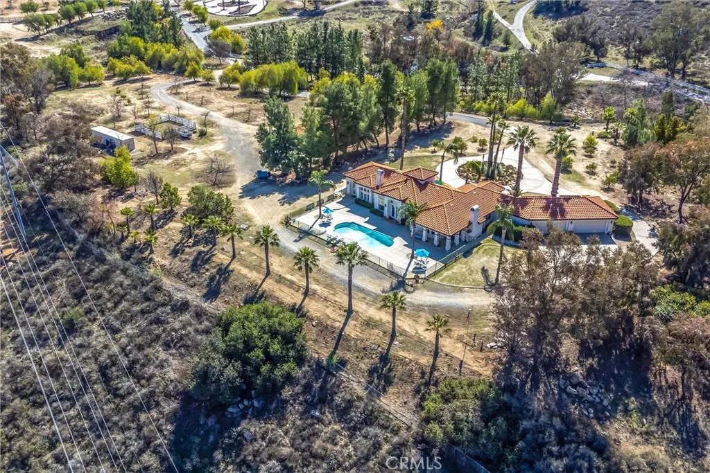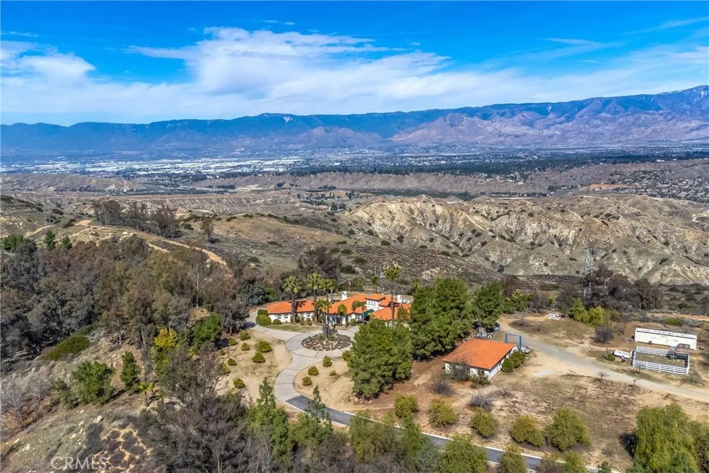 Nestled on a sprawling 10.85 acre estate in the prestigious gated community of Tremont Ranch, This stunning Mediterranean-style home offers unparalleled views of Redlands, San Timoteo Canyon and surrounding mountains. Built in 2000, this single story home boasts 4 bedrooms, 3 baths, and 3034 sqft of luxurious custom living space. The estate includes a 4 car attached garage, and a 1500 sqft detached garage with a lift. Perfect for the car enthusiasts, and for the horse lovers there is a corral. Enjoy your own private well, 22 mature fruit trees, and a sparkling poolside retreat with breathtaking canyon views. This home has an updated HVAC unit, 220v hookups and cleanout for your RV, and the home is renovated with a whole house plumbing re-pipe. Work at home with an office/library. The entire home has custom mahogany wood cabinetry. The spacious primary bedroom suite includes sitting area and bathroom with shower, and jetted tub. Solid wood doors wider than standard are throughout the home. Lincoln pavers and wood flooring elevate the interior with custom textured walls. Plantation shutters and ceiling fans are in all bedrooms. The kitchen has granite countertops and backsplash, with views of the pool. Fireplaces are in the den and living room for those chilly nights. This home can be sold fully furnished offering a move-in-ready experience. This custom home provides ample room to grow on this expansive estate. Whether you are sipping coffee poolside overlooking the canyon, or picking fruit from your trees, this South Redlands haven combines luxury, privacy, views for days an