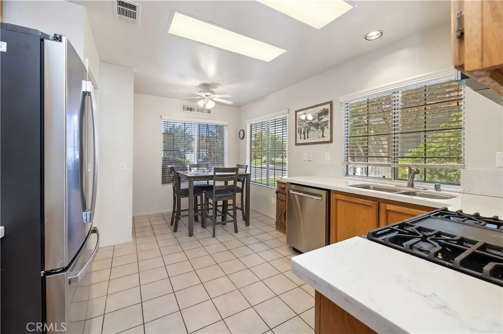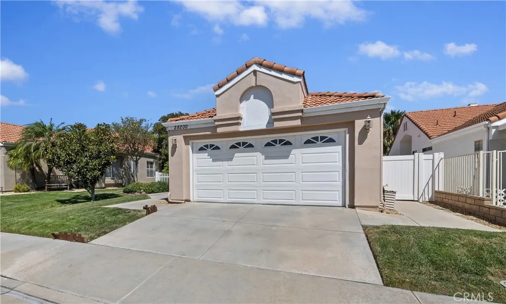 Discover the perfect blend of comfort and convenience in this lovely single-story home located in the Palmilla on the Greens 55+ Senior Community. This home features 3 bedrooms, 2 baths with 1206 square feet of living space. The 3rd bedroom is versatile and being used as an exercise room with no closet. This residence offers soaring vaulted ceilings, an open floor plan, and a cozy fireplace for those relaxing evenings. The kitchen shines with natural light, quartz countertops and newer GE stainless steel appliances. Cozy breakfast nook eating area. Step outside to a private backyard retreat with newer vinyl fencing, a full-length covered patio, and fruit trees an ideal setting for outdoor living and entertaining. Living in Palmilla on the Greens means access to a pool, spa, and clubhouse, plus all the Menifee Lakes amenities including lakeside trails, a gym, golf, picnic areas, fishing and more. With its central location you are near lots of shopping and dining, Loma Linda Medical Center, Kaiser Medical Center, Temeculas award-winning wineries, and casinos plus quick freeway access every convenience is within reach. Menifee is the fastest growing city in California. Low taxes, low HOA. Come live the good life!