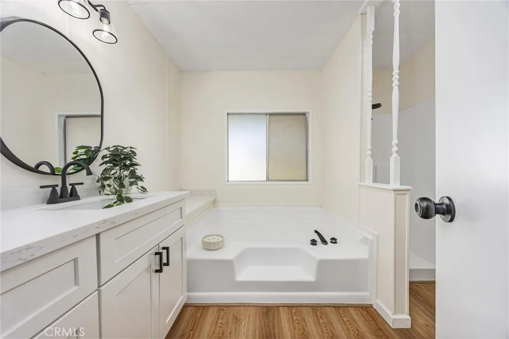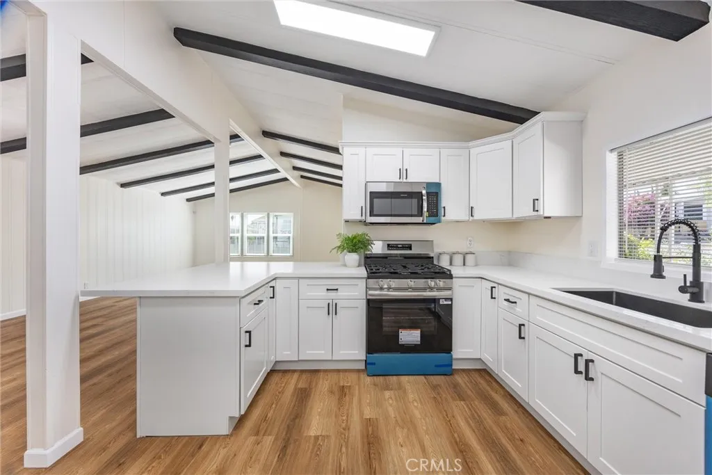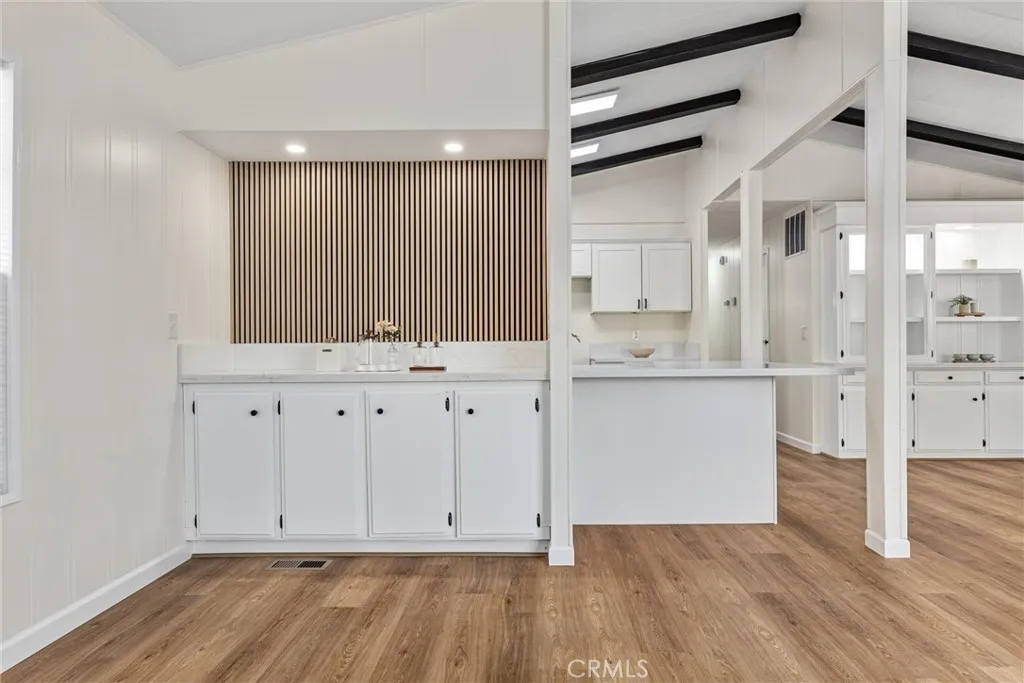 Welcome to this charming and tastefully updated 2-bedroom, 2-bath 1,440 sq/ft manufactured home in the serene community of Kern Canyon Estates. Inside, enjoy modern style paired with cozy comforts, including fresh paint, wood-like flooring, and central AC and heating for year-round comfort. The contemporary kitchen boasts sleek quartz countertops, stainless steel appliances, updated cabinetry with modern pulls, a built-in coffee bar with elegant wood slat accents and bar height seating optionsperfect for casual dining or entertaining. A bonus built-in cabinet provides excellent storage. The primary suite offers both a separate shower and a relaxing bathtub, while both bathrooms shine with quartz countertops and chic mirrors. Outside, enjoy access to exceptional community amenities including a sparkling pool, pickleball court, and putting greenembrace a lifestyle of comfort and leisure.