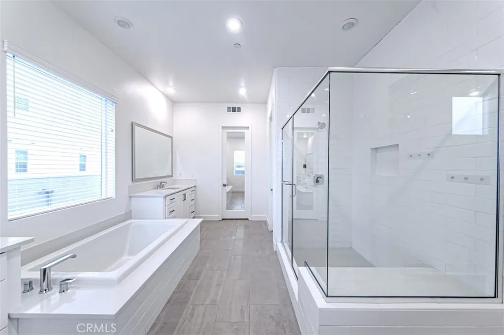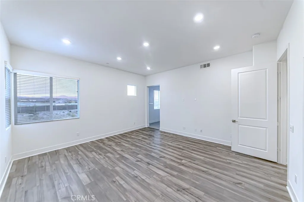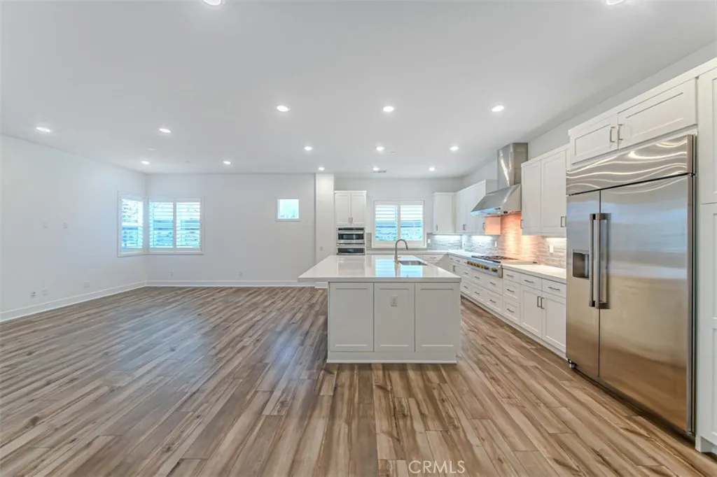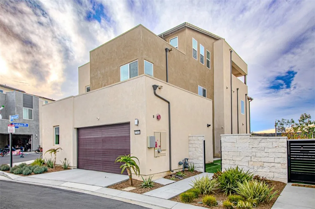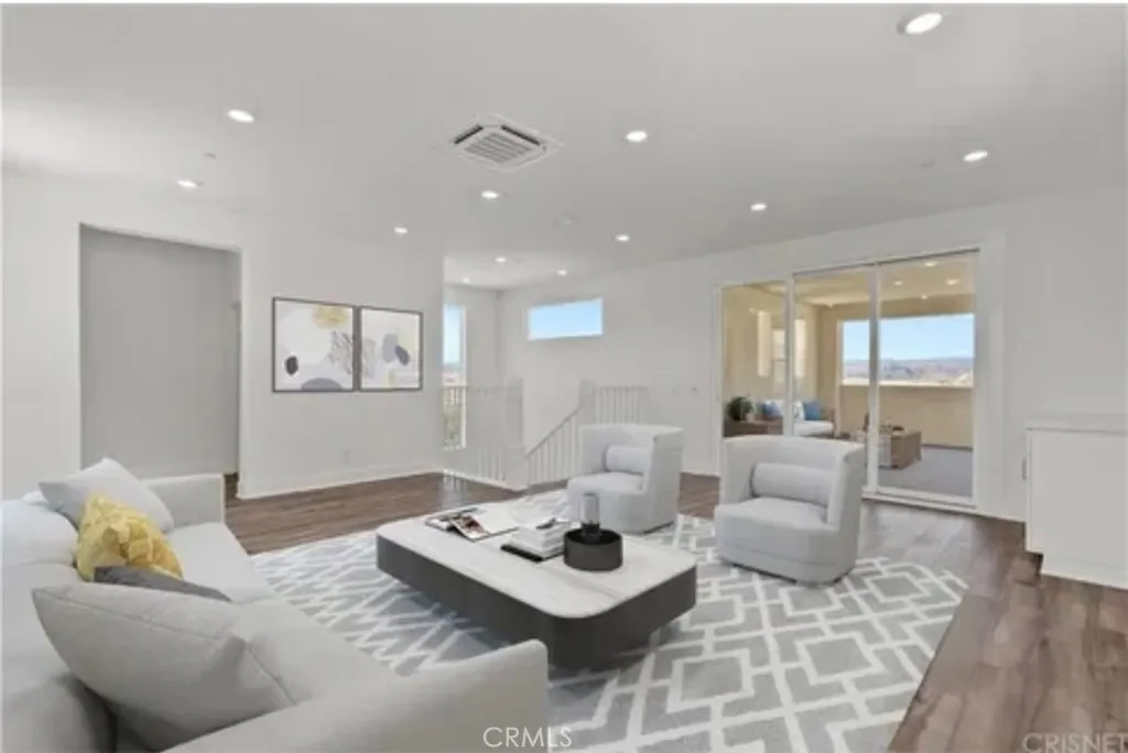 Welcome to modern luxury in the heart of Five Point Valencia. This stunning Lennar Rosemist Plan 4, the largest and most desirable model in the community, was completed a couple years ago and offers the perfect blend of sophistication, comfort, and style. With five bedrooms, four and a half bathrooms, and three spacious levels, this home showcases impeccable design and attention to detail. The main floor features an open-concept, dining area, and chefs kitchen with a large quartz-topped island, professional-grade stainless steel appliances, and a six-burner cooktop with designer hood. Ten-foot ceilings and wood-like LVP flooring create a sense of warmth and grandeur throughout. A guest bedroom with a full bath on the first floor provides flexibility for visitors, extended family, or a home office. Upstairs, the luxurious primary suite offers a peaceful retreat with a spacious walk-in closet, dual vanities, soaking tub, and separate shower, while three additional bedrooms, two more baths, and a laundry room complete the second floor. The top level is a versatile bonus/loft area featuring its own bathroom, wine fridge, counter space, and a covered terrace with panoramic views of the Santa Clarita Valleyperfect for a game room, gym, or lounge. Extra storage in the 2 car garage with EV charging station. Enjoy year-round outdoor living with a gated backyard and covered patio ideal for dining or relaxing. Located within the vibrant Five Point community, residents have access to world-class amenities including three pools, a spa, BBQ areas, playgrounds, scenic greenbelts, and a re
