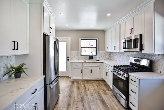 *BACK ON THE MARKET BUYER COULD NOT PERFORM AFTER ESCROW OPENING THE FIRST WEEK* Take advantage and discover this stunning, totally remodeled 4 bedroom, 2 bathroom home, offering 1,174 Sqft of thoughtfully updated living space. Nestled on a spacious 7,181 Sqft lot on a peaceful cul-de-sac, this home boasts undeniable curb appeal. Ample parking and clean water Eco lawn landscaping adorn. Step inside to find a beautifully updated kitchen and bathrooms that boasts gleaming quartz countertops and beautiful backsplash, white shaker cabinets with soft-close doors and drawers, black hardware and fixtures, and stainless steel appliancesall designed to inspire your inner chef. The homes 2 bathrooms have been tastefully remodeled. The hall bath offers a full tub with shower, while the primary bath features a walk-in shower with a sleek glass enclosure. Throughout the home, each room enjoys it's own mini split for heating and air-conditioning for better efficiency and economy. The attached garage offers secure parking and additional storage. Step outside to your spacious backyard where a covered patio, and generous side yards provide the perfect setting for relaxation or entertaining. There is also potential for RV parking on the east side of the driveway, offering a convenient space for your recreational vehicle or storing outdoor gear additionally the owners have installed a new 50amp plug in the garage to charge EV's. The back yard has plenty of room to add that ADU for additional living and/or income. Ideally located near Disneyland, Garden Walk, and freeways, this home offers eas