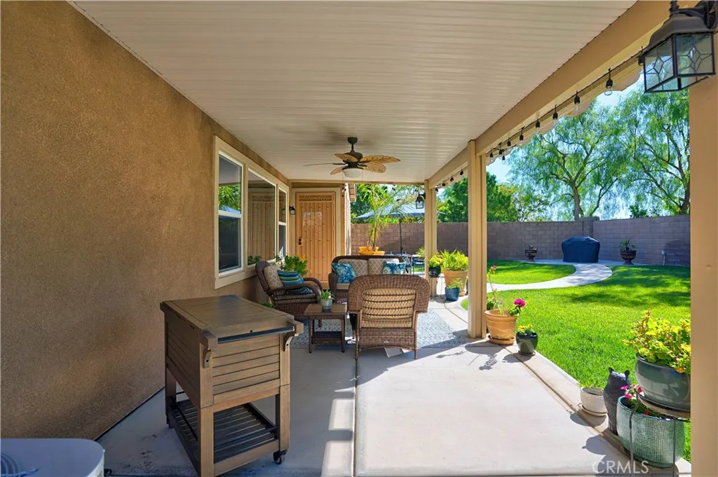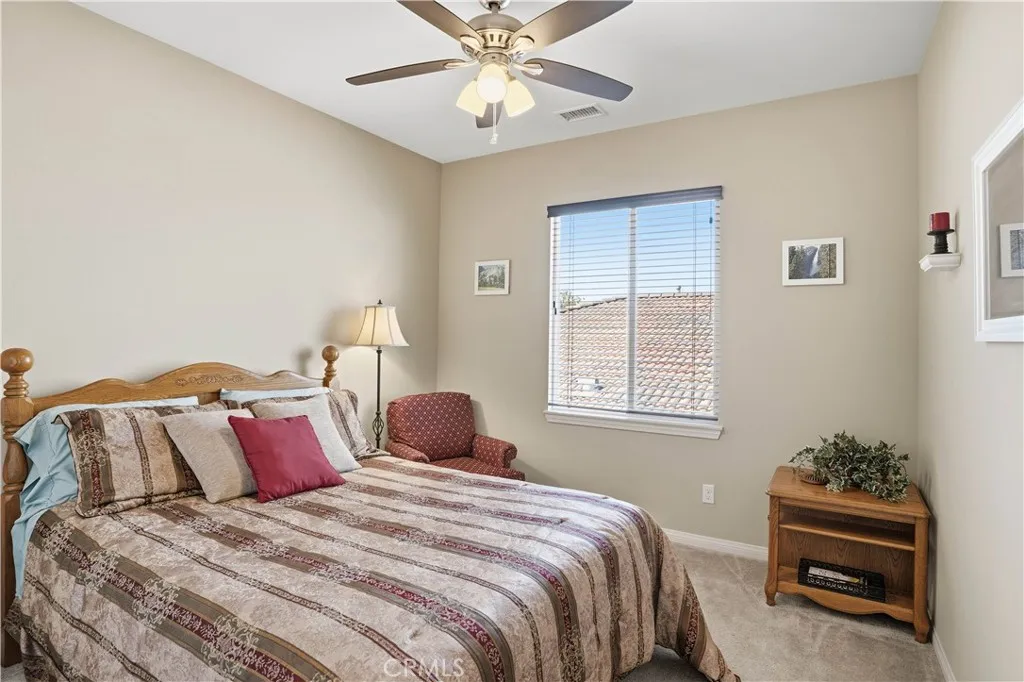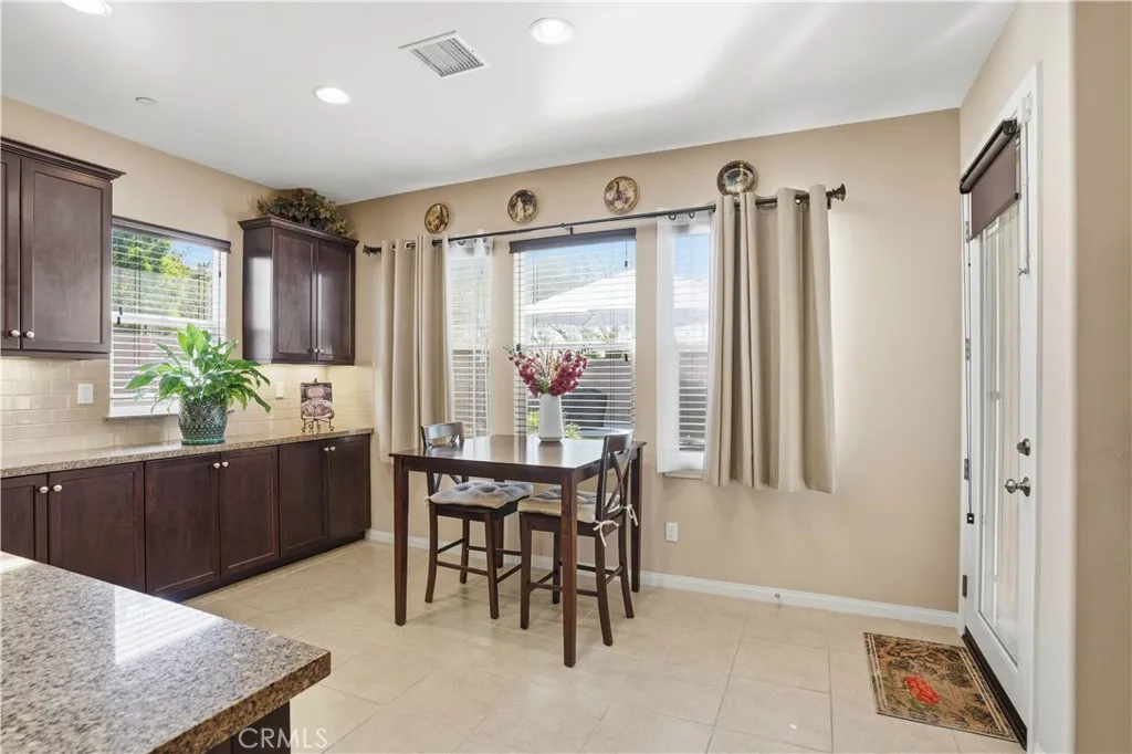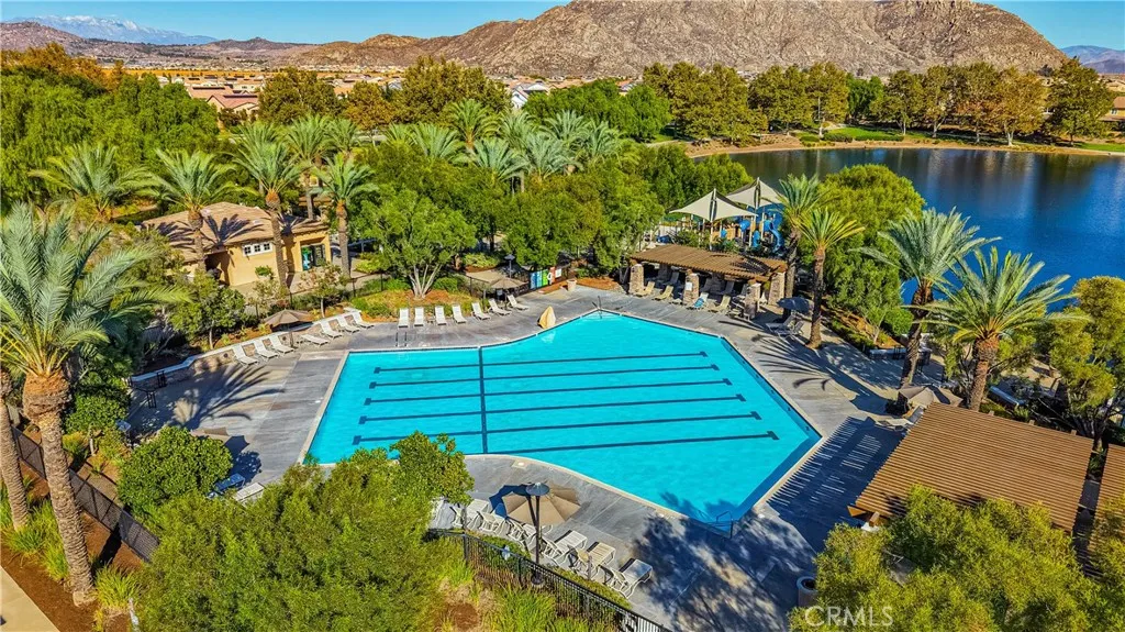 LOOKS AND FEELS LIKE A MODEL HOME!! MOVE IN READY!Welcome to this lovely home with a bright, open floor plan that's perfect for everyday living and entertaining. You'll love the spacious great room right off the kitchen, ideal for gatherings with family and friends. This spacious family room allows you to relax and enjoy the views of the beautiful landscaping and nearby hills and mountains. The gourmet kitchen features granite countertops, mocha cabinetry, extra cabinets, double oven, 5 burner cook top, large island with breakfast bar and a nice size pantry. Just off the kitchen is a formal dining area and from there you'll find a full downstairs bedroom and bathroom. Perfect for guests or a comfortable home office. As you head upstairs there are three additional bedrooms plus an open loft featuring extra recessed lighting. a perfect entertainment area and for a pool table. The convenient upstairs laundry room adds even more functionality. Outside, enjoy a private backyard with a block wall, large side yard, Alumawood patio cover with a ceiling fan ideal for relaxing or hosting gatherings. The oversized three car garage provides plenty of space for parking and storage with epoxy flooring and has a tankless water heater. So many HOA amenities include 2 pools, lake, splash park for kids, pickleball, tennis courts and much more! A must see! TURNKEY! Perfect for a growing family, close to schools and parks..