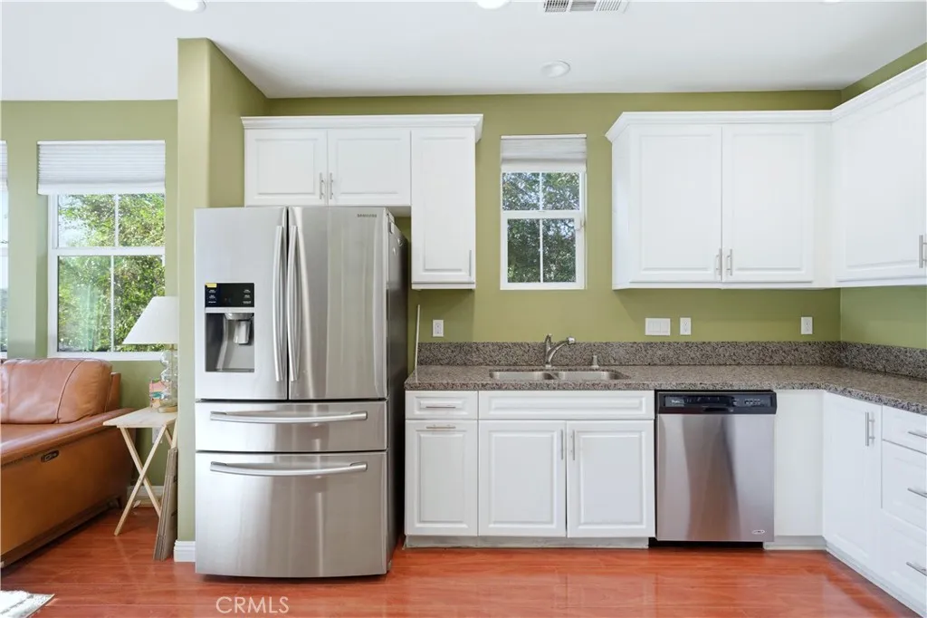 Beautiful Condo with Balcony in New Haven, Ontario Ranch. Welcome to this stylish and well-maintained 2-story condo in the desirable New Haven community of Ontario Ranch. Built in 2016, this home features 1 bedroom, 1.5 bathrooms, and 990 sq. ft. of modern living space. The open floor plan includes a bright living room with direct access to a balcony overlooking the neighborhood. The kitchen boasts granite countertops, an eating area, and stainless-steel appliances, with a refrigerator, stove, washer, and dryer included. The primary bedroom offers mirrored closet doors and an en suite bathroom with dual sinks. Additional highlights include recessed lighting, dual-pane windows, central AC & heat, and a 1-car attached garage with direct access. Enjoy resort-style living with HOA amenities including 6 pools, 3 spas, pickleball and basketball courts, BBQ areas, playgrounds, and a clubhouse, all with plenty of guest parking.