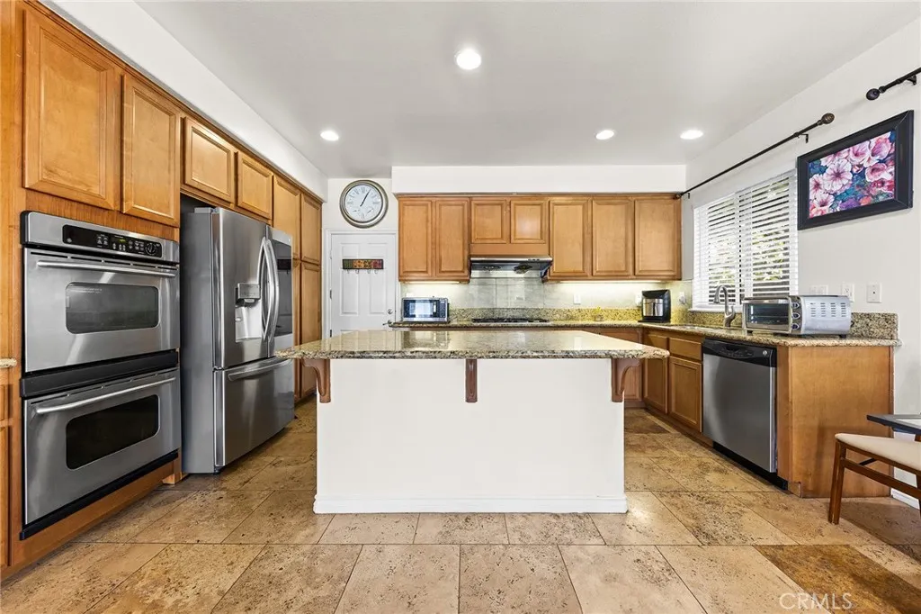 Welcome to this inviting Eastvale residence in the sought-after Harmony Park community. Offering 5 bedrooms and 4 bathrooms across approx. 2,817 sq.ft. on a 7,841 sq.ft. lot, the home features dark hardwood flooring on the main level, a bright formal dining area, and a comfortable family room with fireplace that opens to the backyard. A standout convenience is the main-level suite with kitchenette, washer/dryer hookups, and an independent front-yard entranceideal for guests, multi-gen living, or rental (buyer to verify use/permits). The kitchen centers around an granite island with abundant cabinetry. Upstairs showcases new wood flooring, well-proportioned bedrooms, and a welcoming primary suite. Notable upgrades include an energy-efficient A/C system, upgraded water heater, and a solar array totaling 20 panels. Enjoy an enclosed front yard and landscaped backyard for everyday outdoor living. Prime convenienceabout 5 minutes to Costco, restaurants, and major shopping, and close to parks and schools.