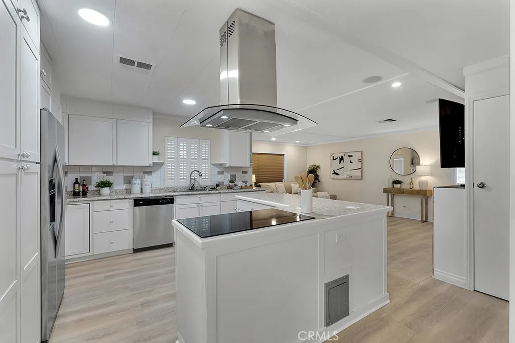 Welcome to 21001 Plummer Street #82, a beautifully updated triple-wide home in the desirable 55+ Sunburst Mobile Home Estates in Chatsworth. Offering approx. 1,768 sq ft, this 3 bed, 2 bath home feels more like a single-family residence than a mobile home. Step inside to a bright, open-concept great room with wide-plank wood-look flooring, recessed lighting and crown molding. The spacious living area features a sleek media wall, with plenty of room to relax or entertain. Just off the living room is a light and airy dining area with a modern ceiling fan and large picture window. The heart of the home is the stunning remodeled kitchen: white cabinetry, expansive counters, subway tile backsplash, stainless steel appliances, and an oversized center island with cooktop and contemporary range hood. Theres incredible storage, generous prep space, and an easy flow to the living and dining areasperfect for hosting family and friends. The primary suite is oversized, with space for a sitting area, a walk-in closet, and an en-suite bath with a large vanity and step-in shower. Two additional bedrooms are ideal for guests, an office, or hobby space, and the second bath conveniently connects to the separate laundry room with extra cabinetry. Outside, enjoy morning coffee or evening breezes on the covered front porch, and take advantage of two tandem parking spaces in the carport. Residents of Sunburst Mobile Home Estates enjoy a friendly 55+ community with a sparkling pool and clubhouse, all in a convenient Chatsworth location close to shopping, dining and freeway access. Move-in ready, s
