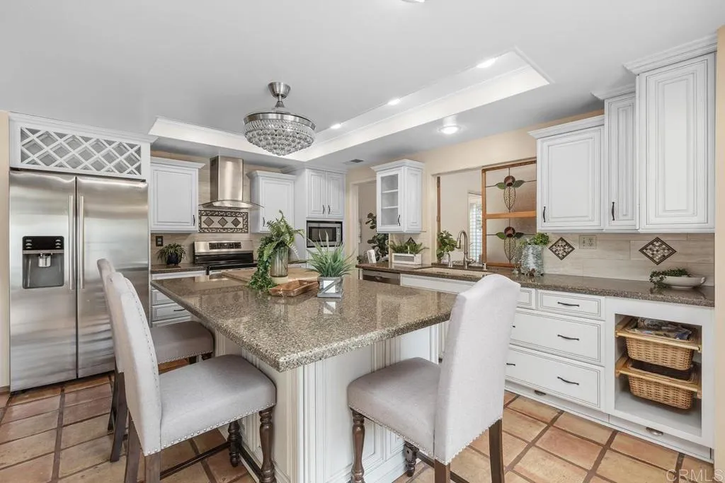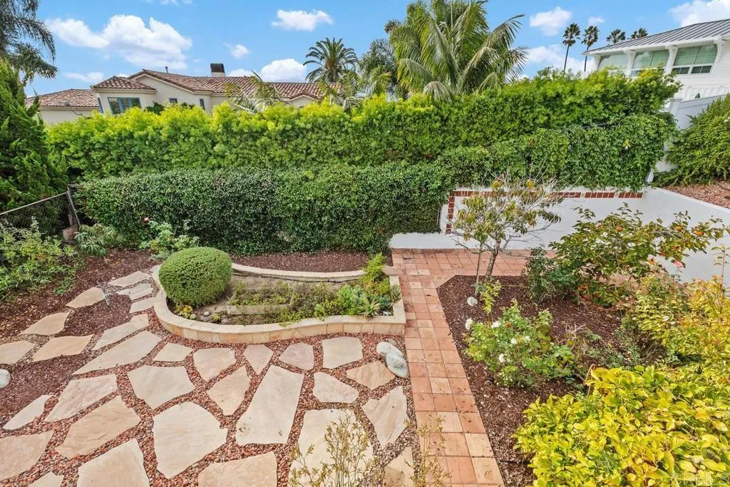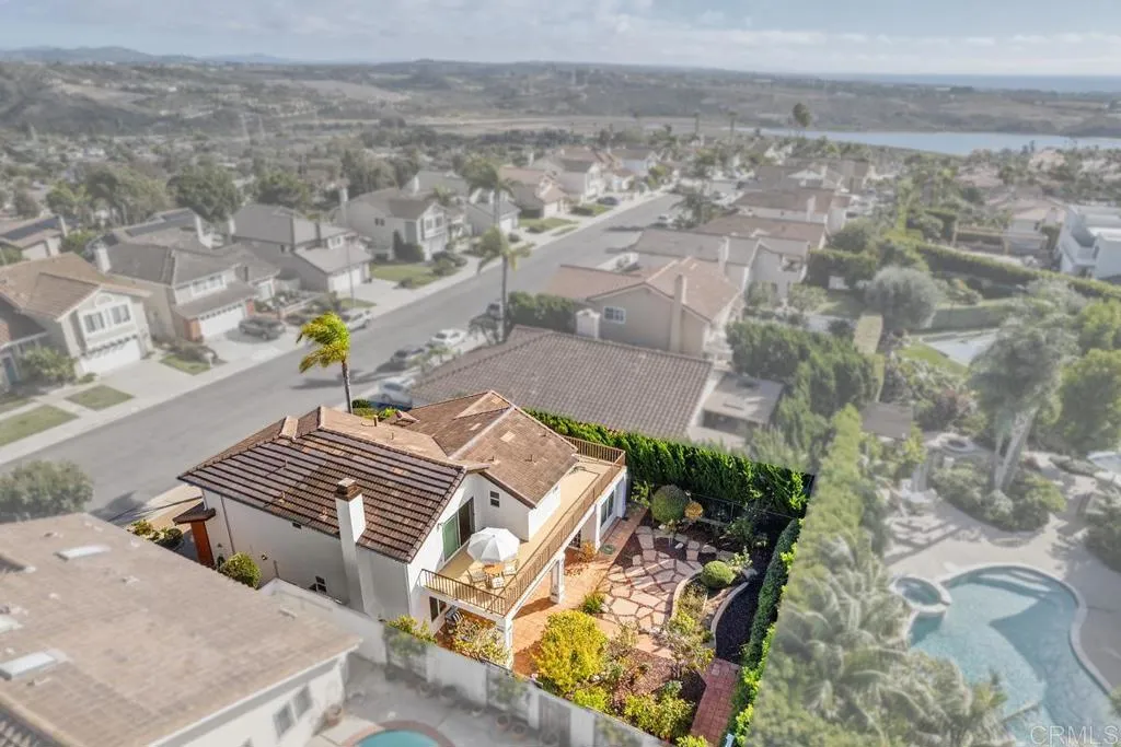 Enjoy the best of beach life in this beautifully maintained Telescope Point home, featuring Agua Hedionda Lagoon views in front and a peek of the Pacific from the back upper deck. Just minutes from Tamarack State Beach and Carlsbad Village, enjoy easy access to restaurants, boutique shopping, and the weekly farmers market. This peaceful neighborhood is known for its ocean breezes, pride of ownership and the nearby top-rated Carlsbad schools. Neighborhood ocean view parks are a short stroll away. This home offers 3 bedrooms upstairs, a main-level bonus room, and 2.5 baths, plus a private backyard retreat. The inviting curb appeal features fresh exterior paint, a paver driveway, new roof (2024) and drought-tolerant landscaping. Inside, vaulted ceilings with exposed beam, skylights, plantation shutters, and Saltillo tile create a bright, airy ambiance. The updated chefs kitchen includes creamy custom cabinetry, a large quartz island with breakfast bar and butcher block, wine storage, stainless steel appliances (Bosch dishwasher and Frigidaire induction range and warming drawer), and opens to a cozy family room with a brick fireplace and backyard access. The permitted main-level bonus room, complete with built-in desks and a private exterior entrance, offers flexible use as an office, guest space, or studio. Step outside to a private garden oasis with covered patio, meandering paver paths, and mature persimmon and peach trees, plus roses, plumeria, and hydrangeasperfect for year-round indoor-outdoor living. Upstairs, the spacious primary suite features western views, access to