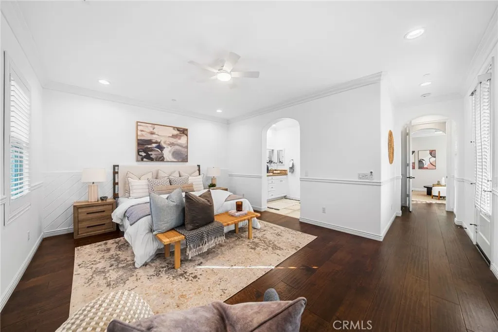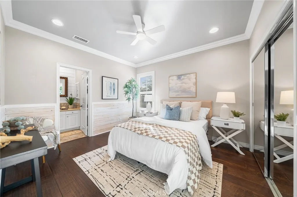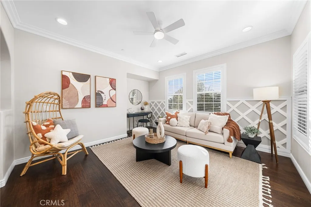 Low Mello Roos at only $141 per month!! This move-in-ready home in the Paloma neighborhood of Portola Springs, Irvine, offers timeless charm, modern upgrades, and exceptional livability. Beyond the private gated entry, a courtyard and side patio create the perfect first impression. Inside, the open-concept layout connects the living, dining, and kitchen areas in a bright, inviting flow. Exposed wood-beamed ceilings, crown moulding, and a freshly painted white brick fireplace bring warmth and character, while wide-plank mahogany hardwood floors pair beautifully with the natural stone tile found in the kitchen and baths. The chef-inspired kitchen features quartz countertops, high-end stainless steel appliances, and a spacious walk-in pantry. Whether youre preparing dinner for two or hosting guests, the design perfectly balances style and function. Upstairs, a generous loft offers flexible space for a home office, playroom, or cozy lounge. The primary suite is a true retreat with its own private patio, a walk-in closet, and a spa-style bath complete with dual sinks, a soaking tub, and an upgraded shower. Two secondary bedrooms share a Jack-and-Jill bath, and the upstairs laundry room adds everyday convenience. With only one shared wall at the first level, enjoy the comfort of added privacy. Additional upgrades include fresh interior paint, updated LED recessed lighting, and new designer-selected furnishings (included with purchase). The two-car attached garage, double-pane windows, and upgraded ceiling fans throughout further enhance the homes comfort and efficiency. Outside,