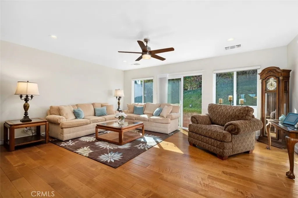 Welcome to this beautifully designed single-story view home, ideally situated on a private corner lot with sweeping city views and an inviting, open floor plan. From the double-door entry framed by elegant pillars to the spacious living areas inside, this home is perfect for both everyday living and entertaining. The home features four bedrooms and three bathrooms, with engineered wood flooring throughout the main living areas and tile in the kitchen and bathrooms. Upon entry, youre welcomed into a spacious living room highlighted by LED recessed lighting and a cozy fireplace, offering a comfortable gathering space, while the generous family room also includes LED recessed lighting, a ceiling fan, and a sliding glass door that opens to the side yard, creating a seamless indoor-outdoor flow. The spacious kitchen is the heart of the home, offering an expansive bay window that showcases panoramic city views, a large center island, cranberry granite countertops, abundant cabinet space with maple cabinets, stainless steel appliances, and LED recessed lighting. Its a wonderful space for cooking, entertaining, and hosting family and friends. The thoughtful floor plan provides excellent separation and privacy between the bedroom wings. On one side of the home, youll find a half bath combined with the laundry room, a bedroom currently used as an office with mirrored closet doors and a ceiling fan, and a spacious primary suite. The primary suite offers LED recessed lighting, a large walk-in closet, and a sliding door that leads to a private backyard retreat. The primary bathroom feat