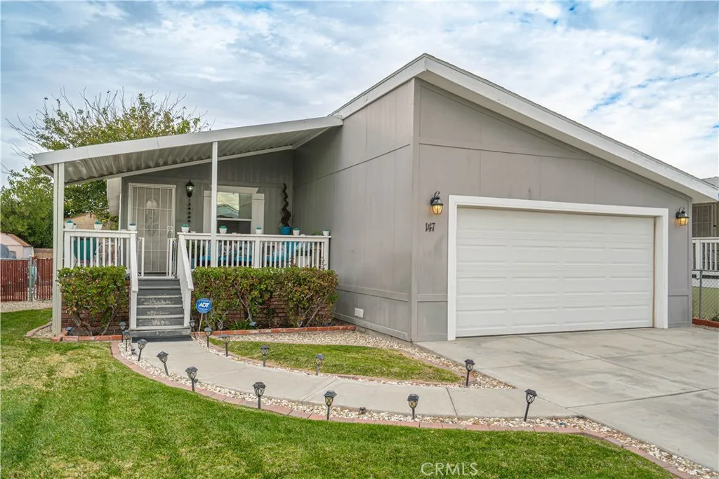 RARE FIND!! Come see this charming 3-bedroom, 2-bath home with attached 2-car garage located in Chaparral Mobile Home Estates, which is one of Lancaster's most desirable and well-maintained all-age mobile home parks! Affordable living at its best. Step inside and you are greeted with a welcoming and open floor plan featuring a generous living area. The home has a spacious dining room as well. The large kitchen has plenty of counter space, lots of cabinets, and a breakfast bar. The refrigerator is included. The primary bedroom includes an en-suite bathroom with a separate shower, soaking tub,and double sink vanity. Two additional bedrooms and a nice hallway bathroom give you plenty of room. There is beautiful laminate wood like laminate flooring throughout. All bedrooms have brand new flooring as well! This home also features central heating and air conditioning. The individual laundry room has cabinets and the washer and dryer, which are included. Beautiful covered front porch is large and inviting and is a great place to relax. There is also a spacious outdoor patio for relaxing or entertaining. Need a garage? Well home offers a direct access 2-car garage. In a great location within the park, the home is located near guest parking and amenities. Chaparral Mobile Home Estates offers quiet living with friendly neighbors. The community amenities include a clubhouse, pool, and nicely landscaped grounds. Conveniently located close to shopping, dining, schools, and freeway access for an easy commute. Whether you're downsizing or buying your first home, this well-cared-for home m