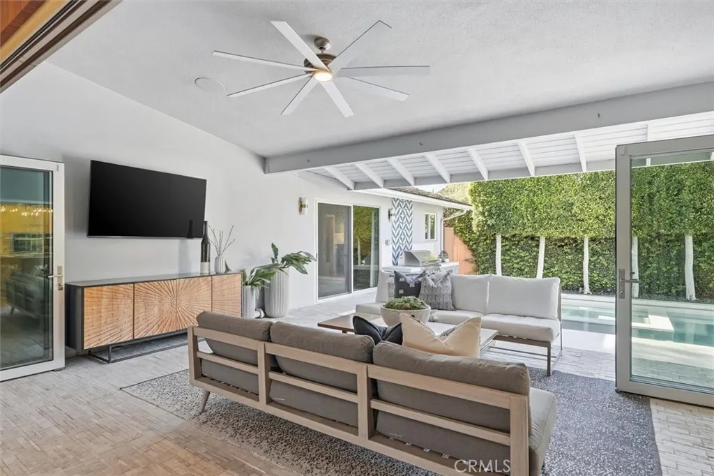 The Peterson Residence (1957), designed by renowned architect Hugh Gibbs, FAIA, is a custom mid-century modern gem situated in the coveted Park Estates neighborhood of Long Beach. Elegant in its finishes yet relaxed in its open layout and seamless indooroutdoor flow, the home offers approximately 2,830 square feet of living space with four bedrooms and four bathrooms, three of which are ensuite. The expansive living room and generous dining room each feature their own fireplace, while the enlarged, upgraded kitchen includes premium Miele and Wolf appliances. Western Window Systems glass doors in both the living room and kitchen fold fully open to connect the interior to the lanai and pool area, erasing the boundaries between indoors and outdoors. The outdoor spaces have been thoughtfully transformed, featuring professionally designed front landscaping with pristine lawn, olive trees, and lighting, as well as a completely reimagined private backyard with a pool/spa equipped with a retractable safety cover, a spacious patio ideal for entertaining, and a built-in barbecue station. The garage has also been significantly enhanced with added attic storage, upgraded cabinetry, a mini-split HVAC system, a refrigerator, and an additional bathroom. Substantial investments in recent years have preserved the homes architectural character while elevating its comfort and functionality. Located on a quiet, tree-lined interior street on a lot of more than 11,000 square feet, this residence offers a rare blend of architectural pedigree and exceptional neighborhood setting. Experience first