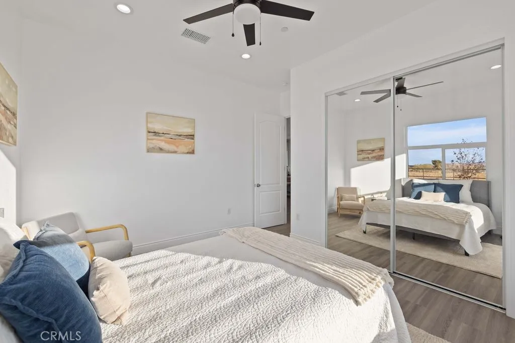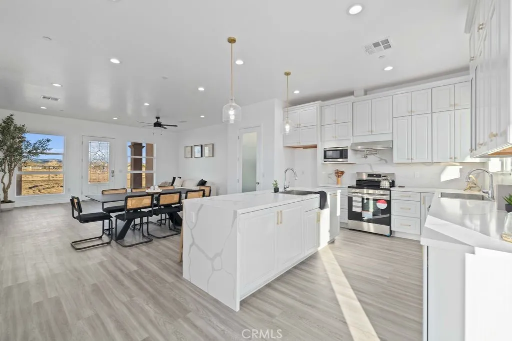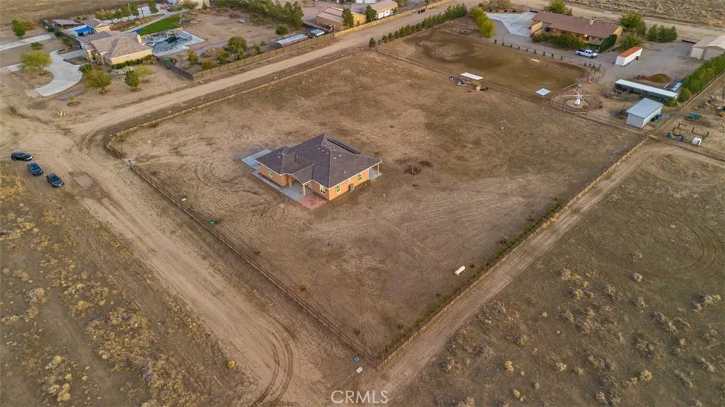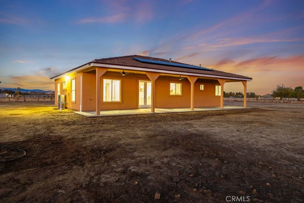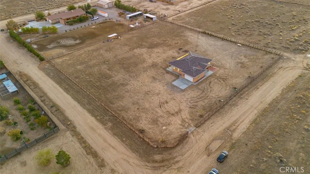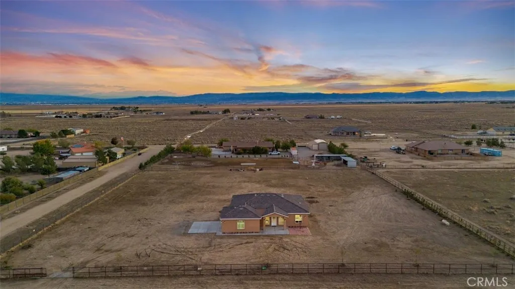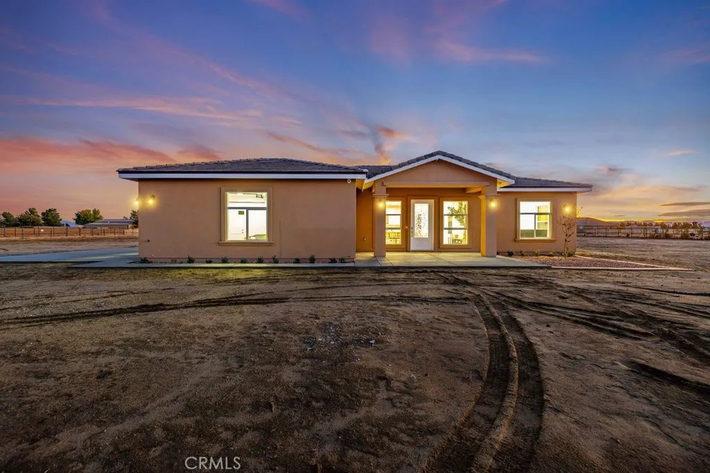 Brand-new 2025 construction in highly desirable Antelope Acres! This stunning 1,833 sq. ft. home sits on 2.5 fully fenced acres and offers modern comfort, open space, and high-end design throughout. Featuring three spacious bedrooms and two beautifully finished bathrooms, this home is filled with natural light thanks to oversized windows and soaring 10-foot ceilings with 8-foot doors. The gorgeous kitchen is a true standout, showcasing waterfall countertops, abundant cabinetry, two sinksa full kitchen sink plus a convenient prep sinkand a bright, open layout perfect for cooking and entertaining. Oversized windows bring in amazing natural light, highlighting every detail. Enjoy the modern touches throughout the home, including recessed lighting, ceiling fans, and paid solar for energy efficiency. The large master suite offers an enormous walk-in closet and peaceful views of the property. At the back of the home, a full-length covered patio with ceiling fans spans the entire widthperfect for relaxing, hosting, or enjoying the quiet desert evenings. The property is fully fenced with a gated entrance and is located within the Sundale Mutual Water District. A perfect blend of modern design, quality construction, and serene country livingthis home truly has it all.