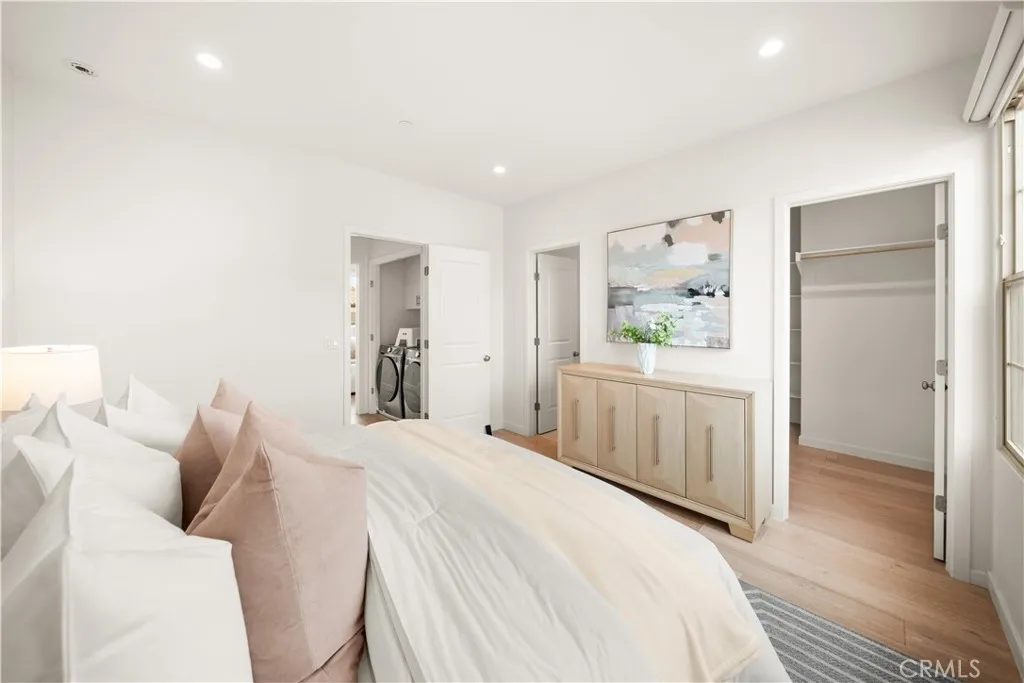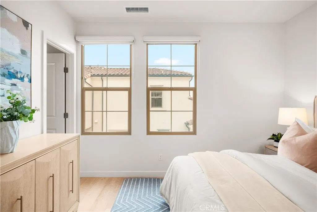 Situated in the serene hillside setting of Portola Springs, 184 Elkhorn is a beautifully maintained Brisa Plan 1 condominium in the heart of Irvine. The home showcases high-end engineered hardwood flooring throughout, creating a seamless and elevated feel, complemented by a bright, open layout designed for both comfort and functionality. The modern kitchen is thoughtfully appointed with quartz countertops, white shaker-style cabinetry, stainless steel appliances, and a generous island with bar seating, seamlessly connecting to the living and dining spaces filled with natural light. The seller has also installed a brand-new premium heated water purification system, along with a whole-house water softener system, ensuring improved water quality, reduced mineral buildup, and enhanced protection for plumbing and appliances. A private balcony off the dining area provides a pleasant extension of the indoor living space. The living room and bedrooms are enhanced with sleek motorized window shades, offering a modern, tech-forward touch while providing effortless light control and privacy. Upstairs, the residence offers two spacious en-suite bedrooms, including a well-designed primary suite with a walk-in closet, dual vanities, and a tiled walk-in shower. Additional highlights include upstairs laundry, high ceilings, recessed lighting, an energy-efficient whole house fan, and a tankless water heater. The direct-access two-car attached garage features built-in storage and is equipped with a Tesla-compatible EV charging outlet, making it ideal for electric vehicle owners. Residents of