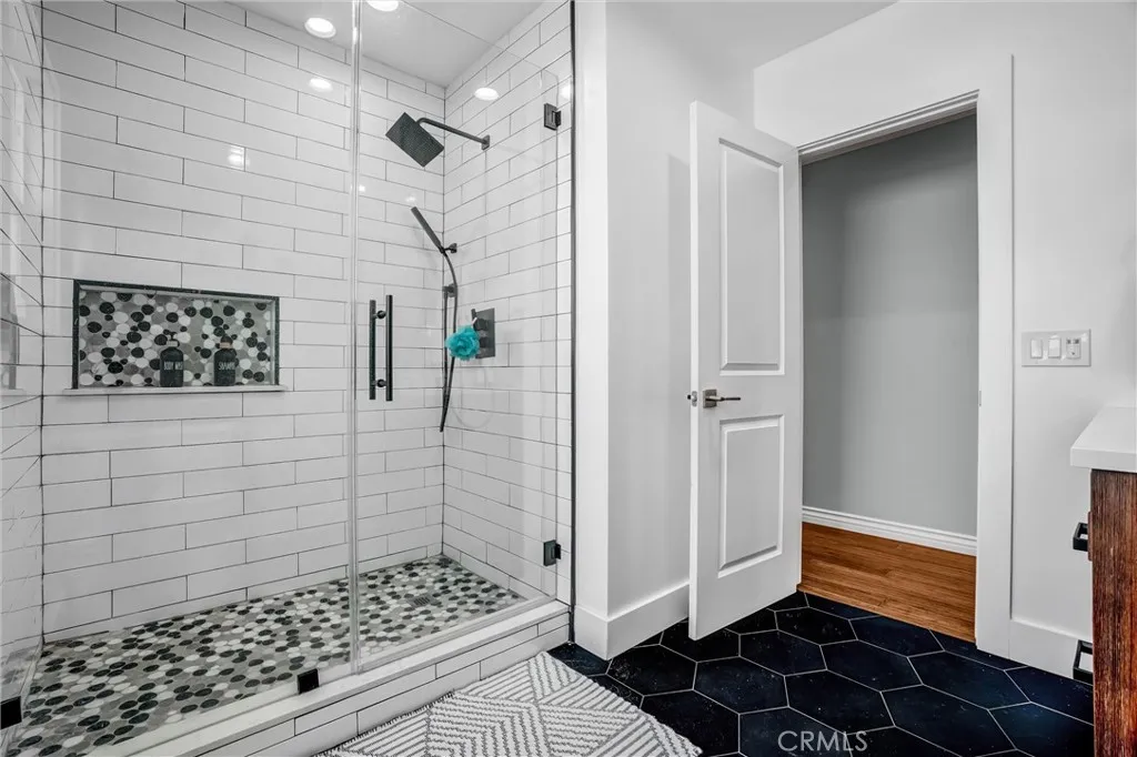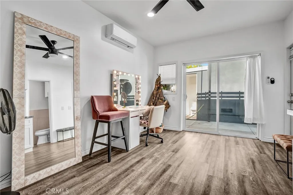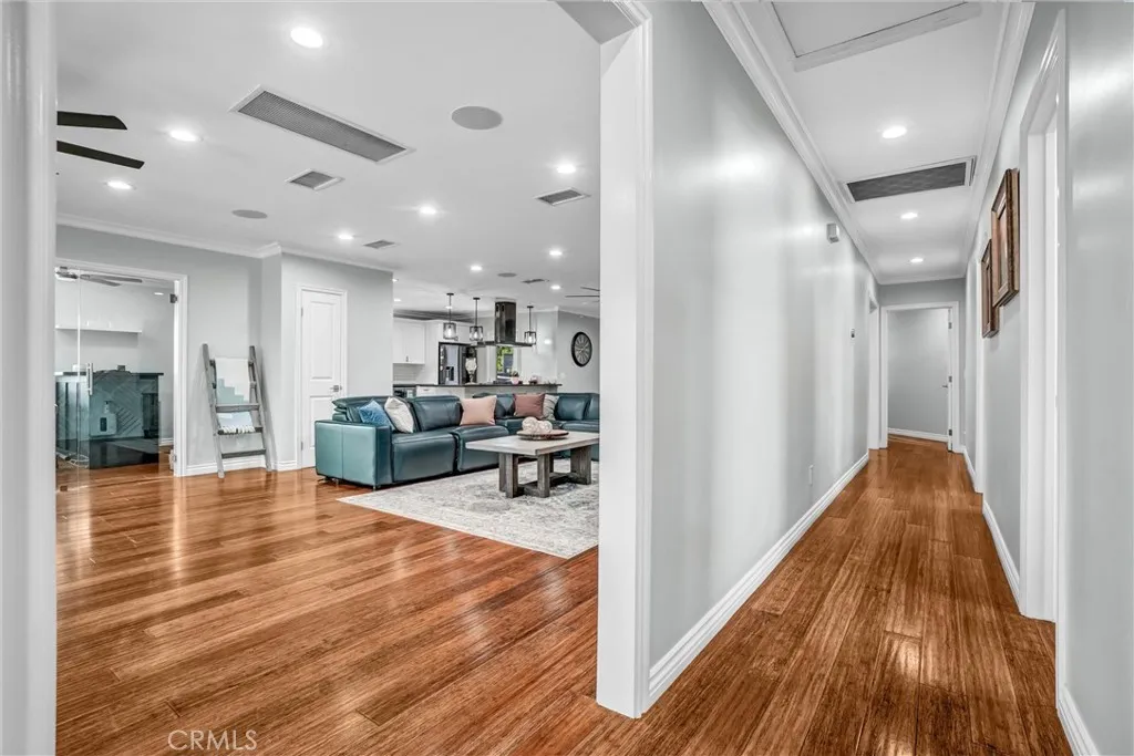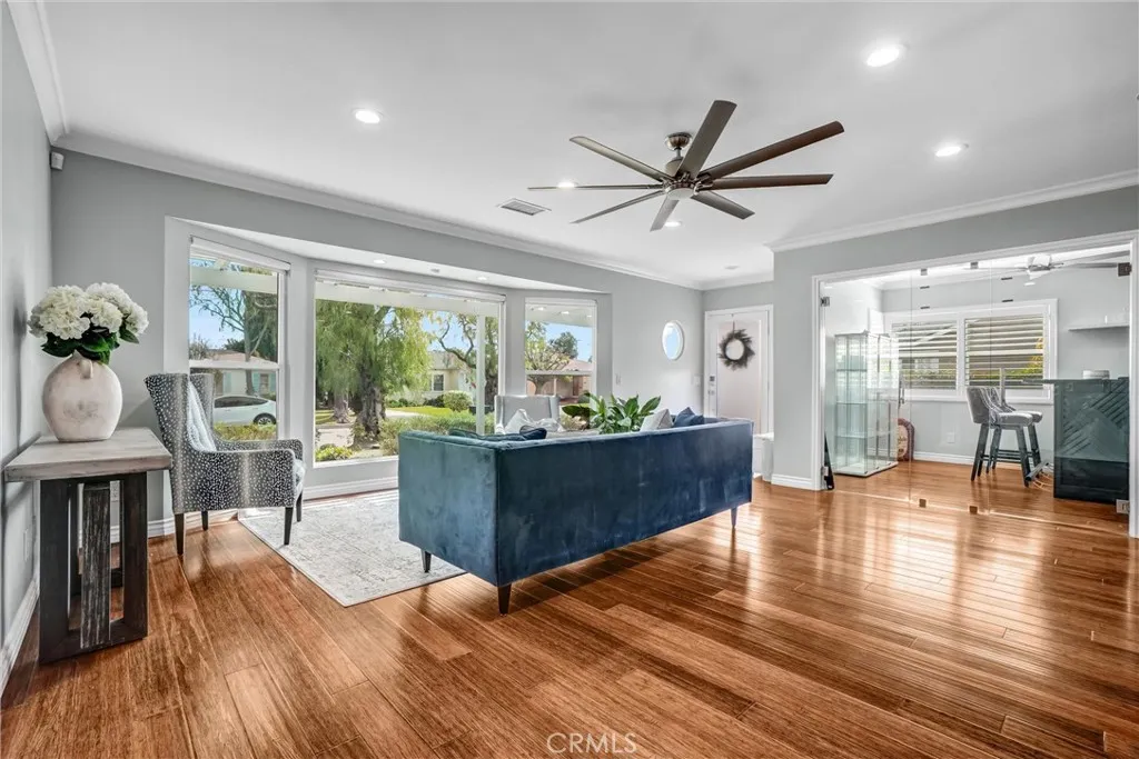Tucked into one of Long Beachs most sought-after neighborhoods, Lakewood Village, this exquisitely curated residence welcomes you into a world of refined comfort, quiet luxury, and effortless multi-functional living. From the moment you enter, the open concept living and dining spaces set an elegant tone, anchored by a statement fireplace, softly diffused natural light through privacy window film with UV protection, and immersive Sonos surround sound throughout the home. The experience extends outdoors to a private, resort inspired retreat featuring a covered patio with built-in lighting and ceiling fan, a dedicated barbecue area, permanent custom smart exterior lighting by EverLights and a discreet outdoor guest bath, an entertainers dream designed for unforgettable gatherings. Two beautifully appointed primary suites create an intimate sanctuary with en-suite baths and individual climate control, complemented by elevated finishes including a bidet toilet, Robern Uplift Tech medicine cabinet, generous walk-in storage, and a large walk-in pantry that enhances everyday living. A dedicated bar room and entertainment lounge adds a layer of indulgence, while the thoughtfully designed guest quarters with kitchenette, private bath, and independent climate control offers exceptional flexibility for extended stays or multigenerational living. Completing the home are modern luxuries including solar, whole house water filtration, central heating and air conditioning, a smart thermostat, integrated security system, tinted windows for privacy and wood floor protection, and a finished g