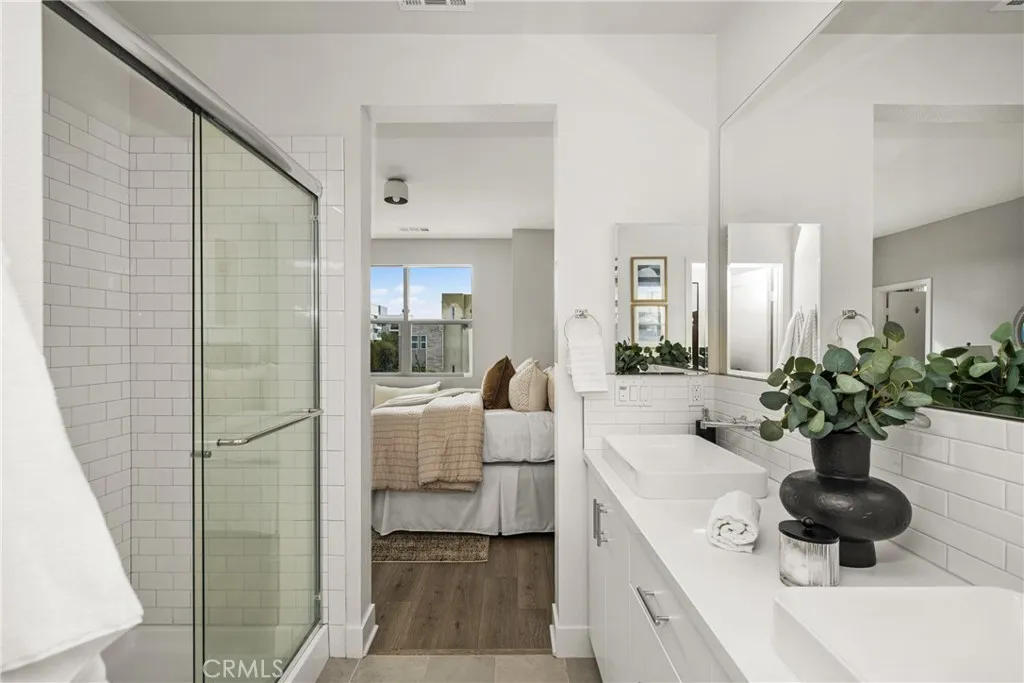 Turnkey Modern Townhome in the heart of Anaheims Platinum Triangle featuring 3 Bedrooms plus a Den, a PRIVATE ROOFTOP DECK, and a direct-access 2-car garage. Ideal for a first-time buyer or investor, with strong rental potential of approximately $4,300 per month. Tucked toward the back of the community, the home offers enhanced privacy in a prime location. The thoughtfully designed floor plan begins with a Den and Powder Room upon entry, providing flexible space for a Home Office, Gym, or sitting area. The Second Level showcases an expansive, light-filled Great Room with high ceilings and walls of windows that flood the space with natural light. The open Chefs Kitchen is designed for entertaining and features white shaker cabinetry, quartz countertops, a white subway tile backsplash, stainless steel appliances, and an oversized island that flows seamlessly into the Dining Area and Great Room. The Third Level offers 3 generously sized bedrooms, including a luxurious Primary Suite with a spa-inspired bathroom, dual vanities, walk-in shower, and a large walk-in closet. secondary bedrooms are thoughtfully positioned at the opposite end of the hall and share a spacious guest bathroom with a soaking tub. Laundry is conveniently located on this level. Escape to the Oversized Private Rooftop Deck to enjoy stunning City and Pool Views. Perfect for relaxing, entertaining, and stargazing, this space truly elevates the home. Energy-efficient features include EV charging, a tankless water heater, and a dual HVAC system. Located just minutes from Disneyland, the Honda Center, Angels Stad