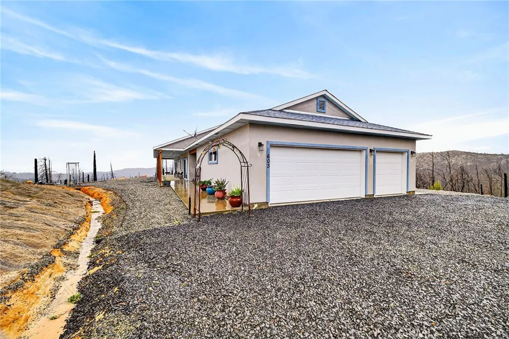 This thoughtfully designed modern construction home built in 2022 and finished in 2023 sits on 19.71 acres with phenomenal views of Bald Rock, the Sutter Butte expanse and coastal ranges and valleys. The home was built thoughtfully with fire resistant products and techniques (concrete style blocks) and features a stunning open concept chef's kitchen with apron sink, stainless steel chef's ZLINE brand oven and matching stainless steel exhaust hood and dishwasher. The kitchen is open to the living room and dining area with a sliding glass door that looks on to the spectacular views that make this property one of its kind. The primary bath boasts a very generously sized walk-in shower with dual shower heads. The guest bathroom is also a delight featuring a vintage retrofitted heirloom vanity, subway tile shower, and glass shower surround. Laminate floors, recessed lighting, tall ceilings and tastefully designed window casings are just additional design features that make this home so elegant. Ample storage options were also incorporated in this design with a mudroom/laundry room/pantry space with it's own door to the wrap around porch. The entire home's perimeter features a concrete wrap around porch so as not to waste a single vantage point of the expansive views. A concrete and covered breezeway gives way to the 3 car garage with ample room for all your toys and tools. The well also offers a hybrid system with a solar powered pump to store water in the storage tank. Call your realtor today for a showing! Properties like this are one in a million!