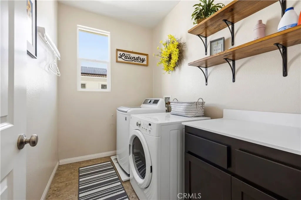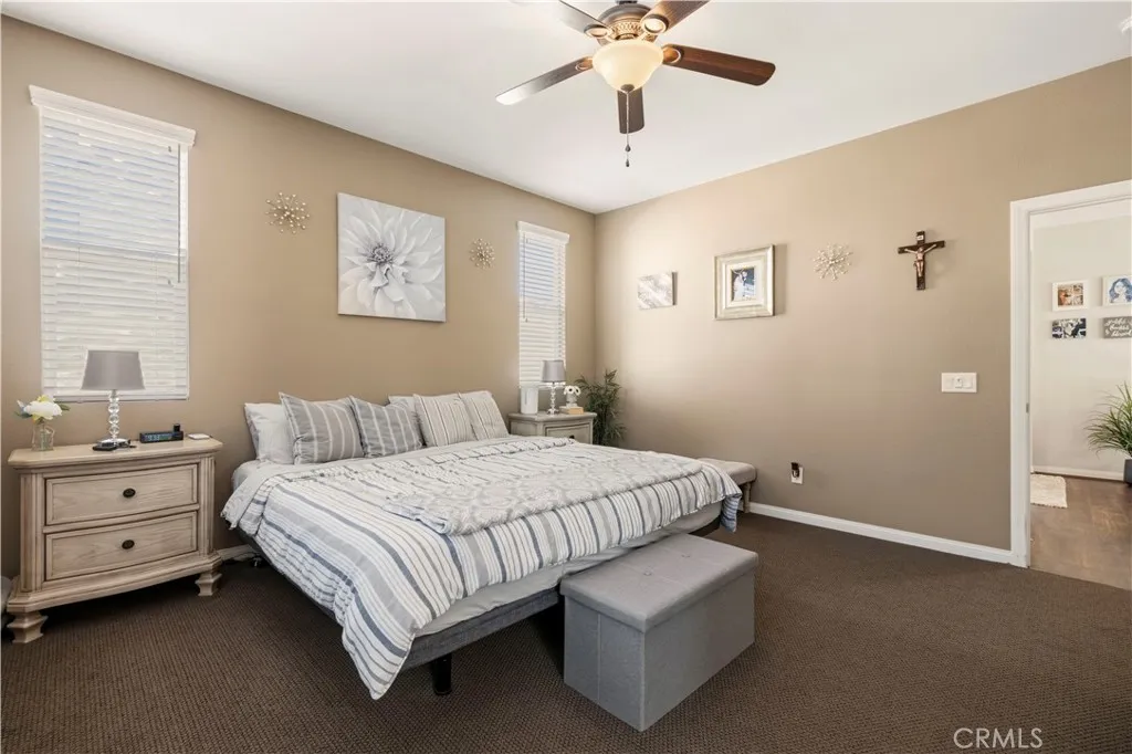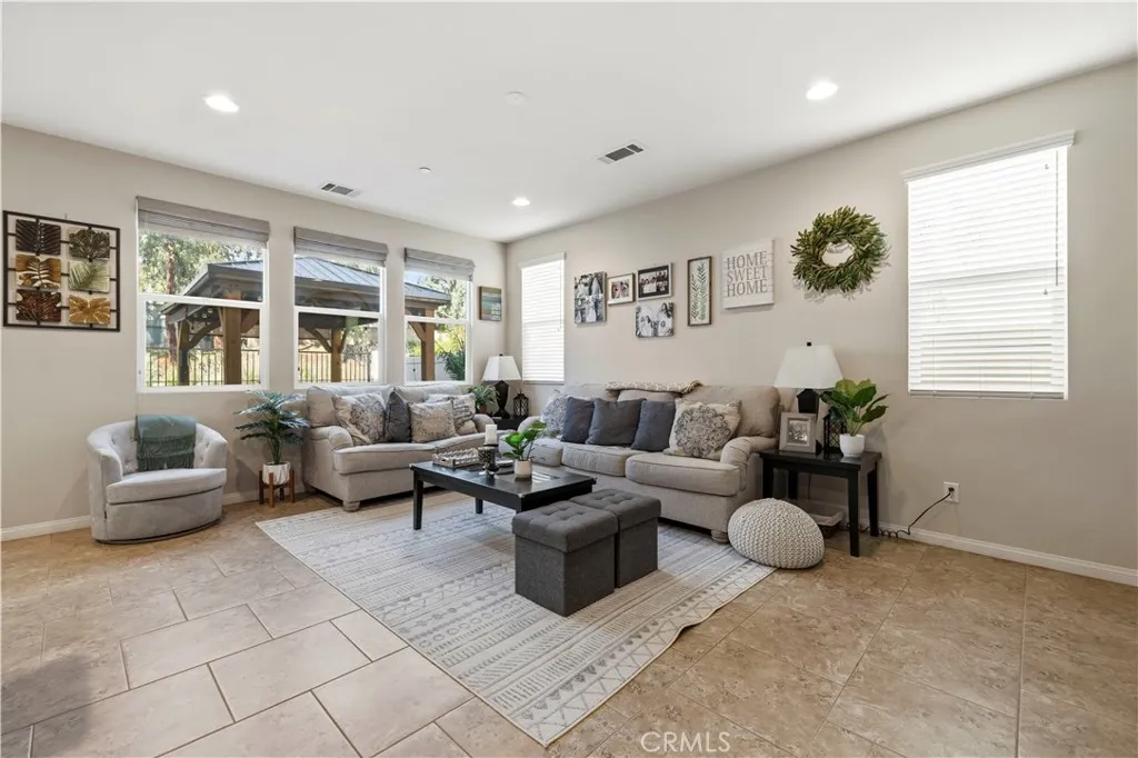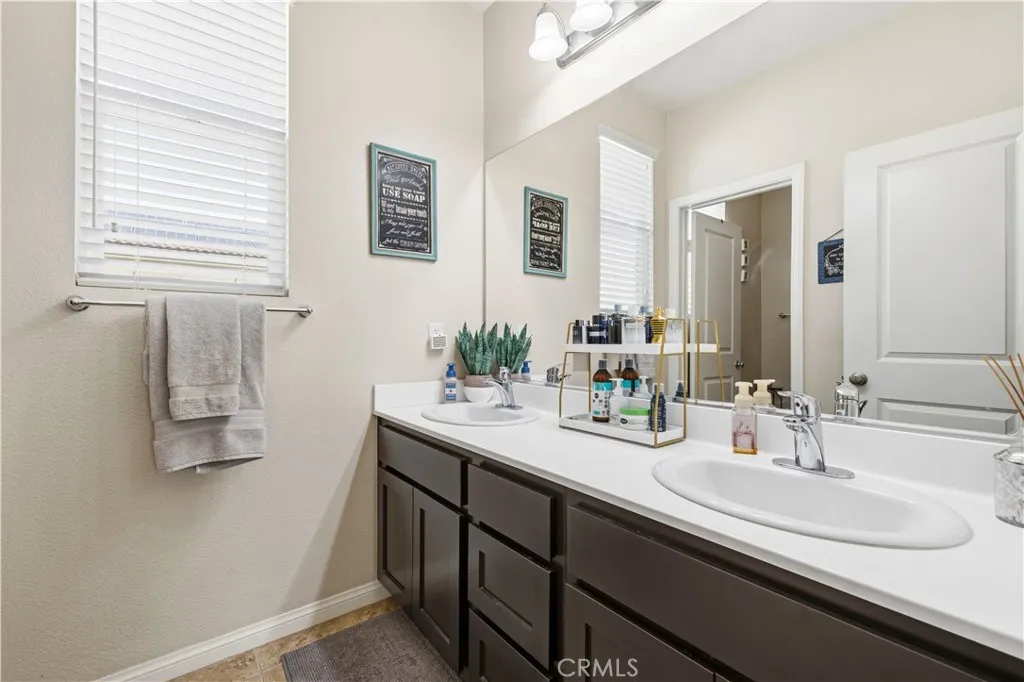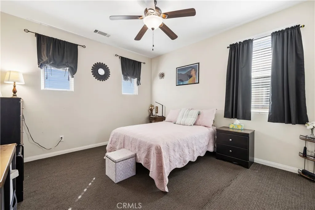 Welcome to 26935 Trestles Drive in the heart of Santa Clarita, located inside a desirable gated community and offering one of the rare full driveways in the neighborhood allowing for valuable additional parking space. This beautiful 4-bedroom, 3-bathroom home features a highly functional floor plan with a full bedroom and full bathroom downstairs ideal for guests, extended family, or a private home office. Upon entry, youre greeted by rich wood flooring that flows seamlessly through the entryway, kitchen, family room, and dining area, creating a warm and inviting atmosphere. The downstairs bedroom features durable vinyl flooring for easy maintenance. The spacious kitchen is the heart of the home, offering granite countertops, an oversized center island perfect for entertaining, a full utility sink, and stainless steel appliances blending style and functionality for everyday living. Upstairs, vinyl wood-like flooring extends through the hallway leading to all bedrooms. The bedrooms feature upgraded carpet in pristine condition, providing comfort and a true move-in ready feel. The convenient upstairs laundry room offers abundant storage space. The hall bathroom includes a dual-sink vanity and a shower/tub combination. All bedrooms including the primary suite are equipped with ceiling fans for added comfort. The primary suite is a true retreat, featuring warm, calming tones that invite relaxation. A custom-built barn door separates the bedroom from the en-suite bath, adding both charm and privacy perfect for the early riser and the late sleeper. The primary bathroom offe