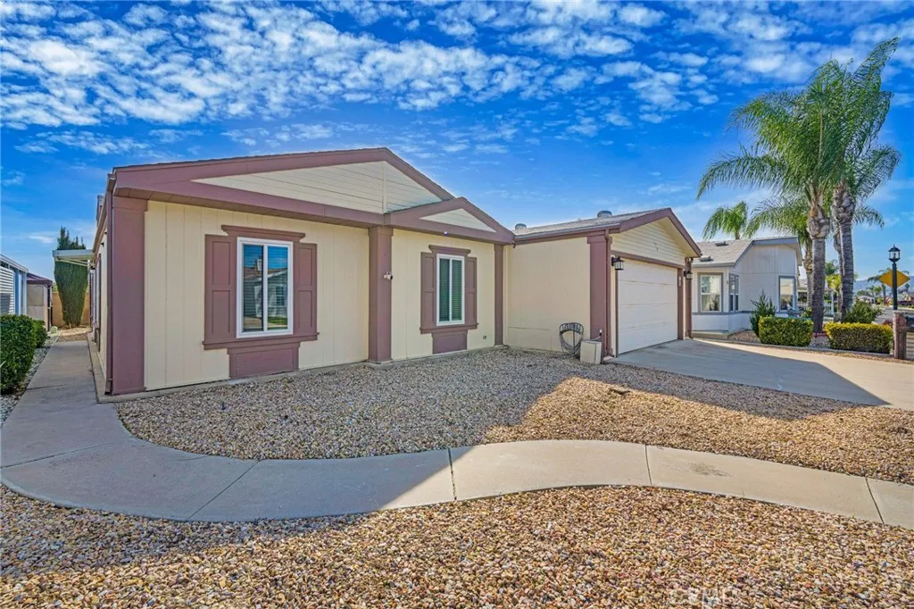 Welcome to this well-maintained double-wide manufactured home located in the desirable Foothills of Hemet 55+ community. Offering approximately 1,152 sq ft, this single-level residence features 3 bedrooms and 2 bathrooms with a functional and comfortable floor plan. The home includes central heating and air conditioning, a kitchen equipped with built-in appliances, and convenient indoor laundry hookups. An attached 2-car garage and private driveway provide ample parking and storage space. Residents enjoy access to community amenities including a pool, spa, clubhouse, gym, billiard room, and card room. Utilities include public water and sewer, natural gas, and electricity for everyday convenience. Ideally located near shopping, dining, and local services, this home offers comfort and affordability in a well-established community.