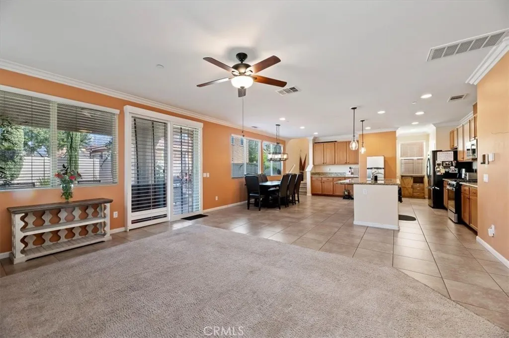 Sundance North Community Move-In Ready Home! This beautiful home offers 4 bedrooms plus a den, easily converted into a 5th bedroom, and 3 full bathrooms. The kitchen features elegant marble looking granite countertops, while the bathrooms showcase sleek quartz surfaces. Large square tile and carpet flooring, crown molding throughout the lower level, and lighted crown molding in the primary bedroom add sophistication and charm. Step outside to a private backyard with a stucco-covered patio, ornamental fountain, rose-bush-accented retaining wall, and vinyl fencing for privacy. The spacious 3-car garage impresses with epoxy flooring, built-in shelving, and a fully finished, painted interior. Located in a welcoming HOA community, residents enjoy access to a pool and spa, basketball court, playground, and bocce ball court. A well-appointed home that combines comfort, style, and everyday practicality.