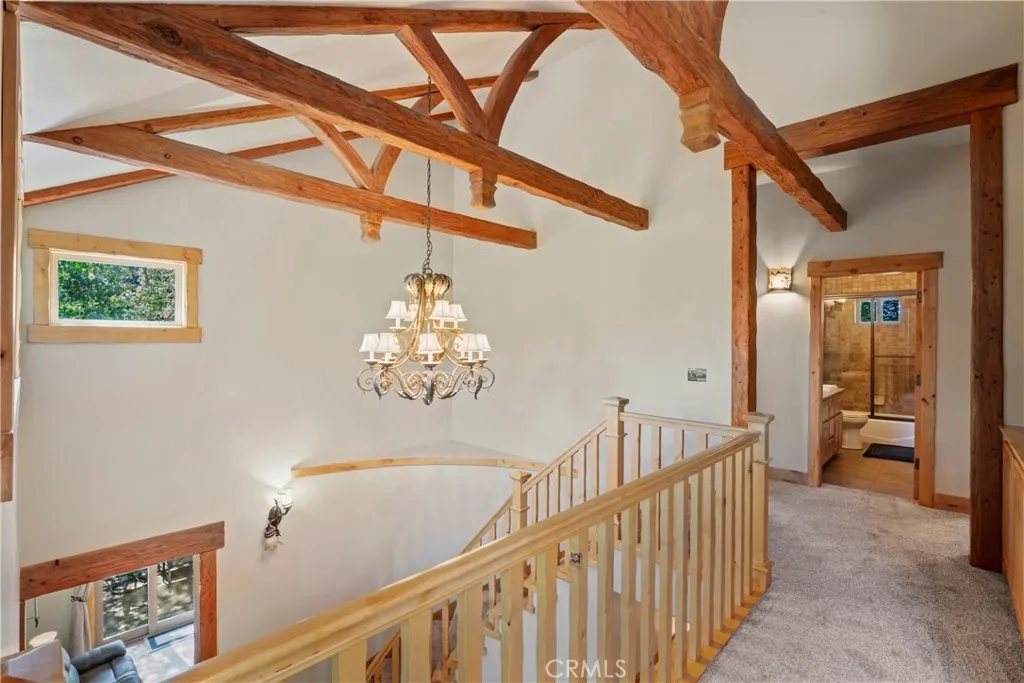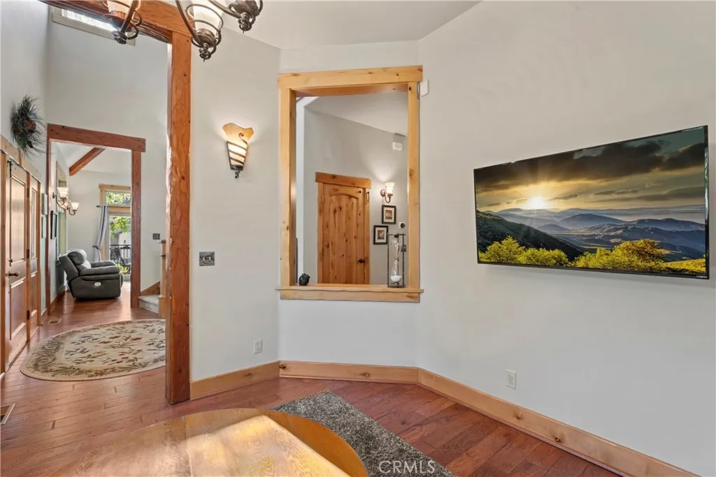 Experience the perfect blend of rugged alpine charm and refined luxury within this quintessential mountain lodge! Situated on a rare flat corner parcel offering full lake rights to private Lake Arrowhead. Custom built for the original owner in 2005, 1034 Teakwood offers a combination of easy accessibility and grand architectural scale. No detail was overlooked utilizing high quality finish work carpenters and high quality lighting fixtures/hardware throughout. Driving into the property you will appreciate hand chiseled split faced granite retaining walls and planters. An oversized 3 car garage provides ample space for vehicles and kayaks, while the dedicated level RV AND BOAT PARKING ensures yours toys are always ready for the next excursion. Reside in a low maintenance house through plaster siding, Trex decking and custom metal decking handrails. Maximum comfort provided by central forced heat and A/C plus Sellers recently installed a 24KW Generac whole house natural gas generator! The perfect property for kiddos and pups frolic within the fenced yard with artificial turf. A grand front door entrance greets you with a dramatic foyer boasting hand carved beams, banister, and rustic door/window casings. Solid wood flooring blankets the entire main living level. A spacious bedroom and full bathroom conveniently located on the entry floor! The kitchen is tastefully designed with knotty pine cabinetry, stainless appliances, double oven, custom mountain theme tiled backsplash, coffee bar, center island, and breakfast bar top. Relax fireside in the vaulted ceiling living room whi