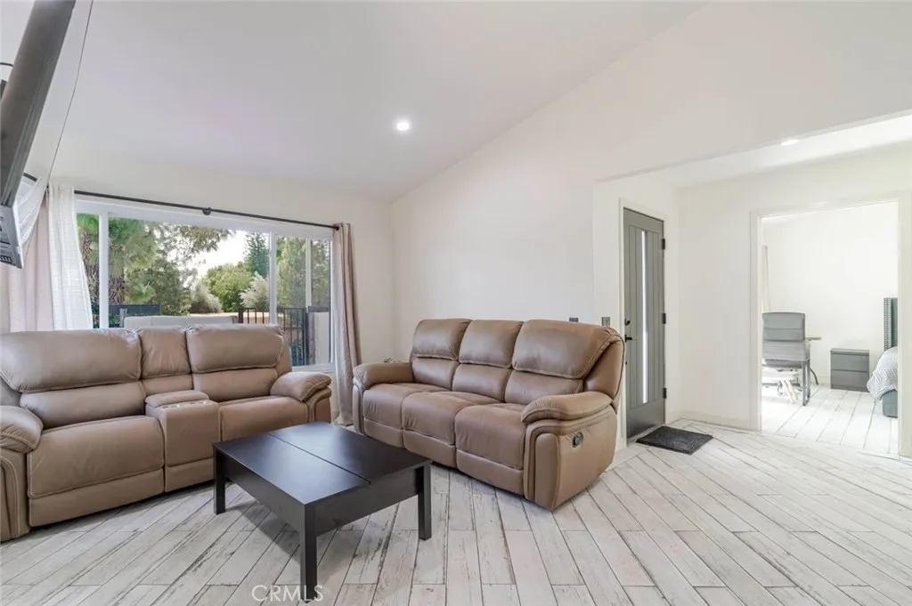 Rancho Cascades Country view single-family home offering over 1,593 square feet of living space with 3 bedrooms and 2 bathrooms. NO HOA and no shared common areas. The living area features a cozy electric fireplace with built-in storage. The home offers porcelain tile flooring, new dual-pane windows, a private bonus room perfect for an office, and a new sliding glass door. Both bathrooms have been completely remodeled with modern tile finishes and custom glass shower doors. Step outside through the back slider to a covered California-room style patio designed for entertaining, complete with a cook center and sink. The property also includes a fully detached 2-car garage with built-in storage, offering potential for conversion into a Next Gen living space or ADUideal for multigenerational living. The gated backyard provides additional parking and separate access. This turn-key home offers versatility and many possibilities, all conveniently located near the 5, 405, 14, and 210 freeways for easy commuting and access to nearby shopping and dining.