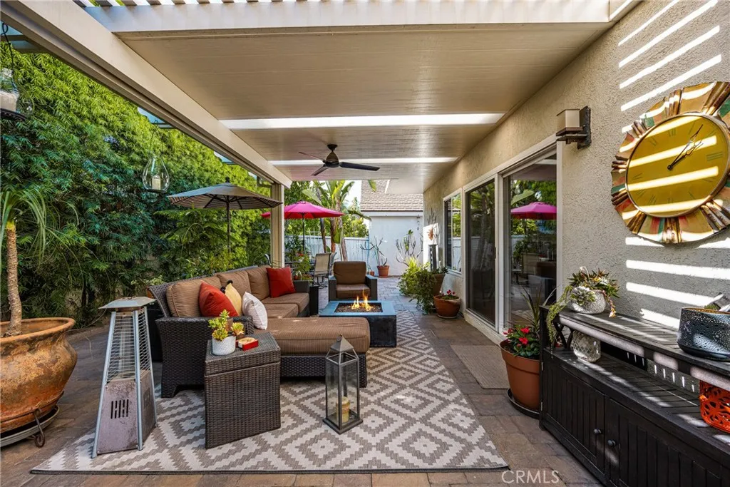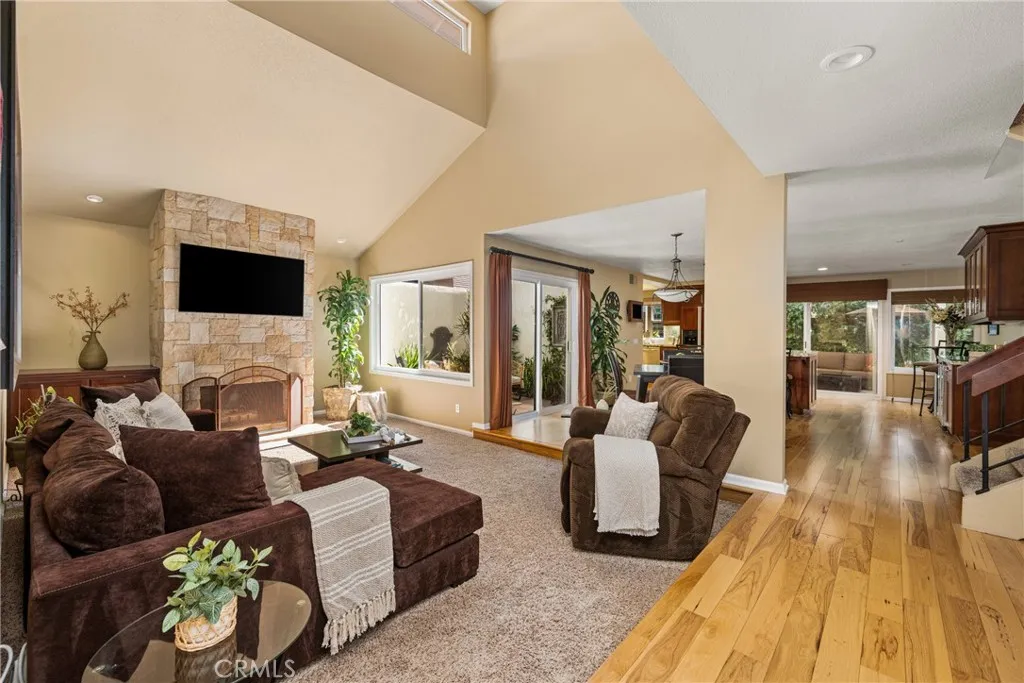 Beautifully updated 4-bedroom, 3-bath home with DOWNSTAIRS BEDROOM & FULL BATH in the highly desirable Woodbridge community of Irvine. The home was thoughtfully EXPANDED by nearly 300 square feet. Step through the stylish modern wood entry door into a dramatic living room with soaring ceilings, abundant natural light, and a striking stacked-stone fireplace that creates a warm focal point. Large windows & sliding doors enhance the open feel and bring in plenty of natural light throughout the main living areas. The REMODELED KITCHEN is designed for both everyday living and entertaining and features rich wood cabinetry, granite countertops, stainless steel appliances, and a large center island with bar seating. The kitchen overlooks the backyard and opens to the dining area and adjacent living spaces. An atrium offers a tranquil outdoor space and brings additional light into the home. Hardwood flooring extends through much of the downstairs, while carpeting adds comfort in the living room and upstairs bedrooms. Tile flooring can be found in the bathrooms. The downstairs bedroom, currently configured as an office, is located next to a full bathroom and can easily function as a guest room, home office, or multigenerational living space. Upstairs, an open walkway connects the spacious primary suite at the rear of the home to two secondary bedrooms and a full bathroom at the front. The primary suite offers generous space, a huge walk-in closet, and a beautifully upgraded bathroom with dual vanities, stone countertops, modern fixtures, and a large walk-in shower with designer tile