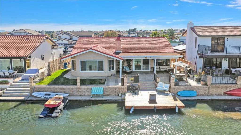 Welcome to lakefront living in Spring Valley Lake at 18310 Niagara Drive, where your backyard becomes the water and everyday life feels like a private retreat. This beautifully remodeled single story home sits directly on the lake with your own private dock, offering true waterfront living in one of the most sought after communities in the High Desert. From the moment you walk in, you will notice the attention to detail with wood looking tile flooring throughout most of the home, tall baseboards, smooth textured ceilings, and updated recessed lighting that creates a clean and modern feel. The kitchen has been fully upgraded with granite countertops, all new soft close cabinetry, stainless steel appliances, and a striking herringbone backsplash that adds a custom designer touch. The home also features all new windows, a newer HVAC system installed within the last few years, and a tankless water heater for added efficiency and comfort. The living room offers a cozy painted fireplace with a gas line and opens up to the backyard, creating a seamless indoor outdoor flow. The bedrooms are well appointed with updated flooring, mirrored closet doors, and great natural light. The hall bathroom features a subway tile shower with glass enclosure, quartz counters, and a clean modern finish. The primary suite is positioned to capture the lake, with multiple windows showcasing the water view, dual sliding closets, and direct access to the backyard. The primary bathroom has been thoughtfully upgraded with a large soaking tub, herringbone tile shower with glass doors, dual vanities, and gr
