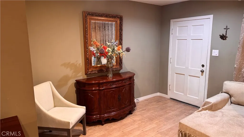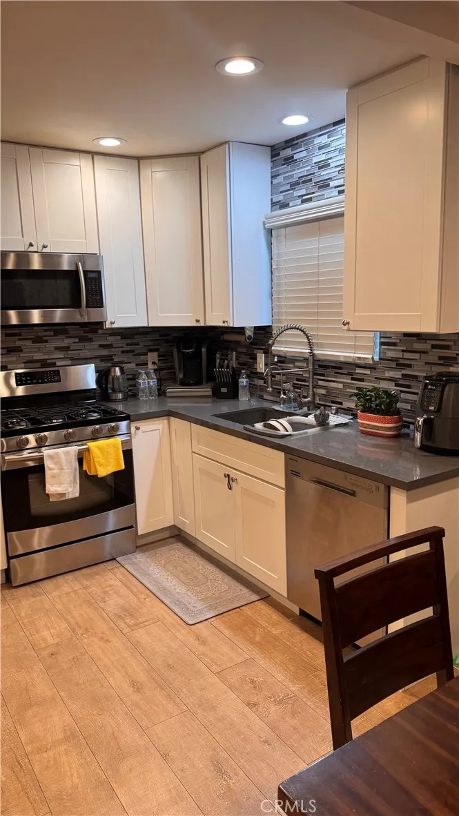 Back on the Market! Fully Remodeled 2 Bed / 1 Bath Move-In Ready! This beautifully reimagined home showcases refined modern finishes throughout, including a designer kitchen with white shaker cabinetry, sleek quartz countertops, mosaic backsplash, stainless steel appliances, and recessed LED lighting. The spa-inspired bath features custom tilework, a quartz-topped vanity, oversized mirror, and rain shower. Upgrades include new dual-pane windows, a new roof, fresh paint, premium flooring, and solid core doors. Enjoy whole-house audio extending to a spacious covered patio, ideal for entertaining. The property also offers a large garage with 220V subpanel, expansive RV parking, and professionally landscaped grounds with automatic sprinklersan exceptional, turnkey offering.