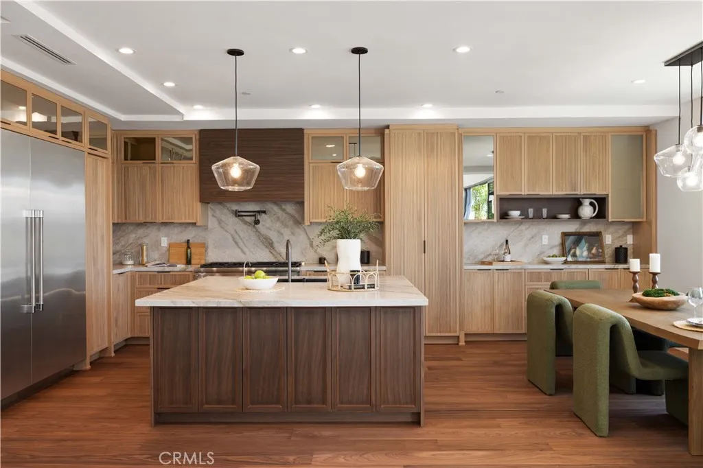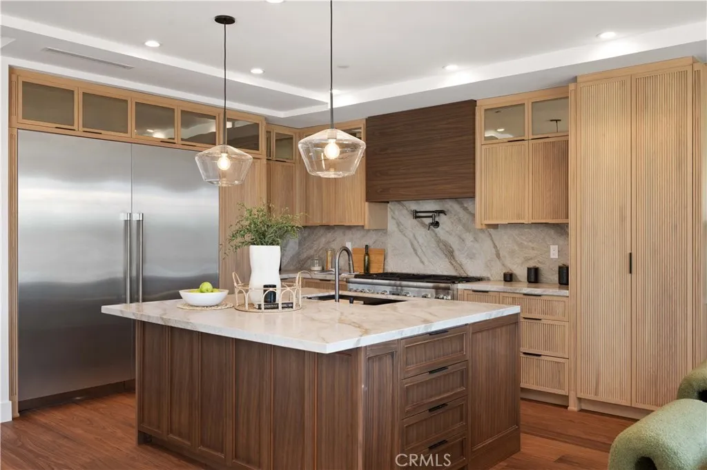 A study in poise and refinement, this residence emerges as a quiet yet commanding statementa one of a kind Masterpiece by Tailor Brothers, whose work consistently aspires to redefine the language of luxury living. The structure does not clamor for attention; rather, it draws the eye through balance, proportion, and an assured confidence in its own craftsmanship, inviting admiration through subtlety instead of spectacle. Here, affluence is not declared, but revealedlayer by deliberate layer. Spanning more than 3,100 square feet across three thoughtfully arranged stories, the home unfolds like a carefully curated gallery. Each space offers a vignette of material, texture, and light, guiding the observer through an experience that feels both intimate and expansive. From the main living area and its elevated mezzanine, the home extends its narrative outwardwhere, at dusk, the distant lights of Palos Verdes shimmer across the horizon like a living tapestry, a quiet spectacle that transforms the everyday into something cinematic. It is a view not merely seen, but experienced, adding a sense of place that is both grounding and transportive. The walnut flooring, rich in tone and continuous in its flow, grounds the interiors with warmth and quiet permanence. In contrast, surfaces of Taj Mahal quartzite introduce a luminous softness, their delicate veining reminiscent of natural landscapes. These refined materials carry through the kitchen and baths, creating a cohesive dialogue between utility and artistry. There is a tactile poetry to the finishes: plumbing fixtures of a caliber ra