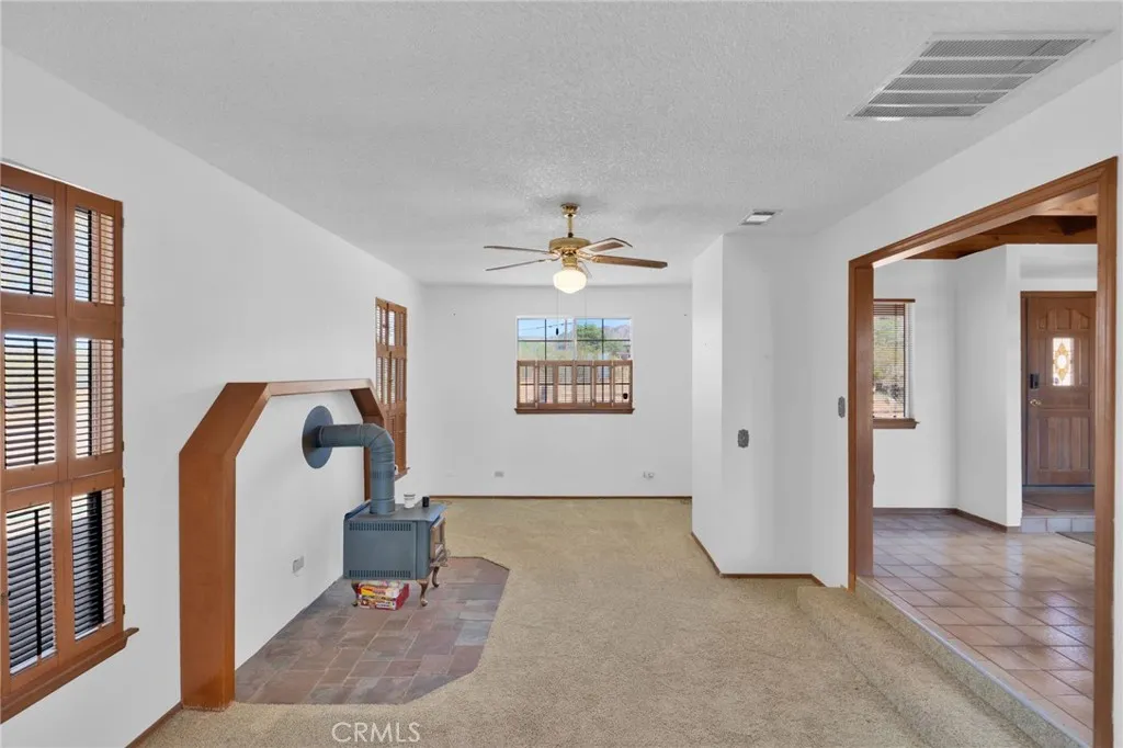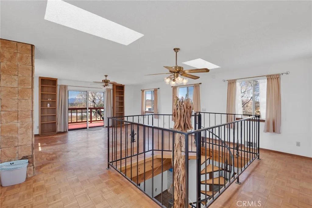 Set on 2 acres in Apple Valley mid-century modern-inspired home blends style, function, and desert living. The 2,010 sq ft residence includes 2 bedrooms, 2.5 bathrooms, and a flexible third room that can serve as an additional bedroom, home office, media space, gym, guest room, or creative studio. Inside, a spiral staircase adds a striking architectural touch, and windows filling the home with natural light while offering peaceful desert and mountain views. Step outside to a private balcony or a backyard oasis with an in-ground pool, perfect for relaxing, entertaining, or enjoying the High Desert sun. Additional highlights include a 2-car garage with a large driveway and fully paid solar, combining convenience and energy efficiency. Located in a quiet neighborhood, this home offers architectural charm, versatile living spaces, and private desert tranquility.