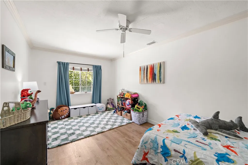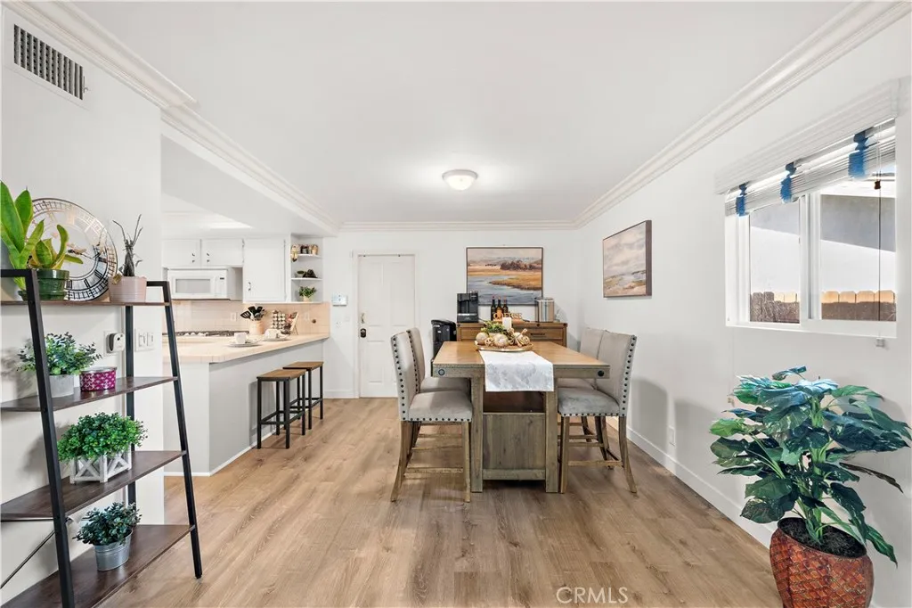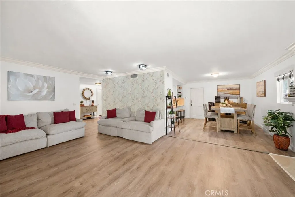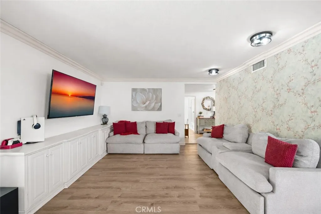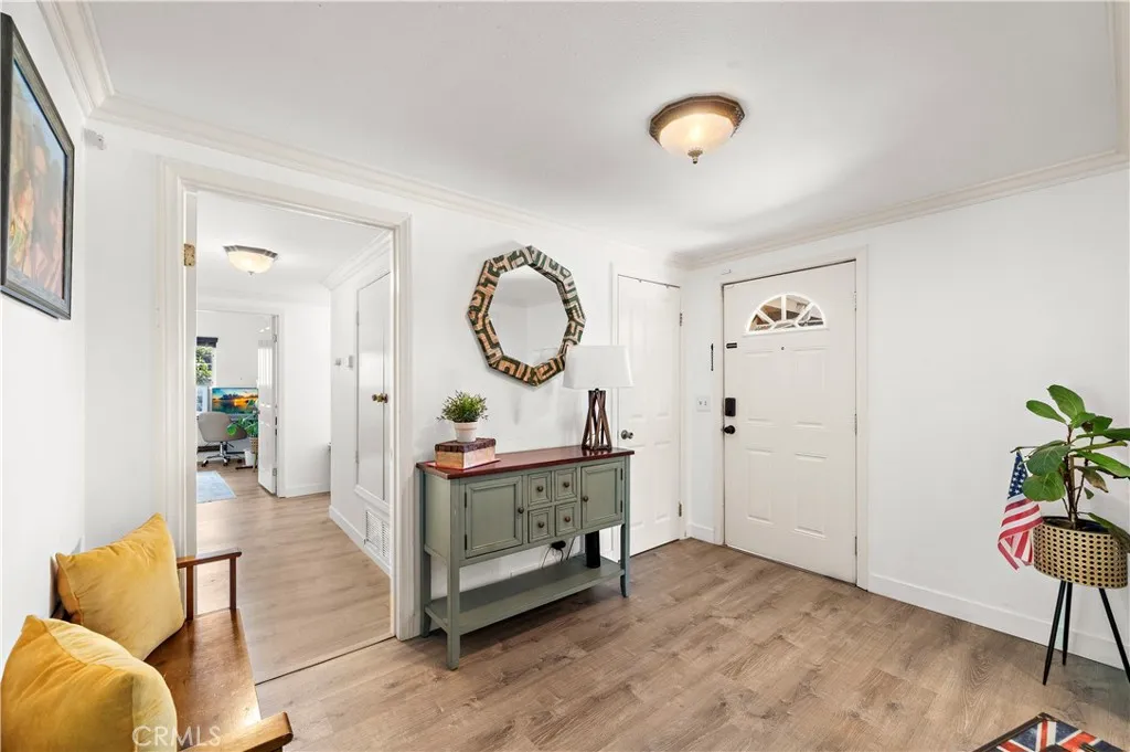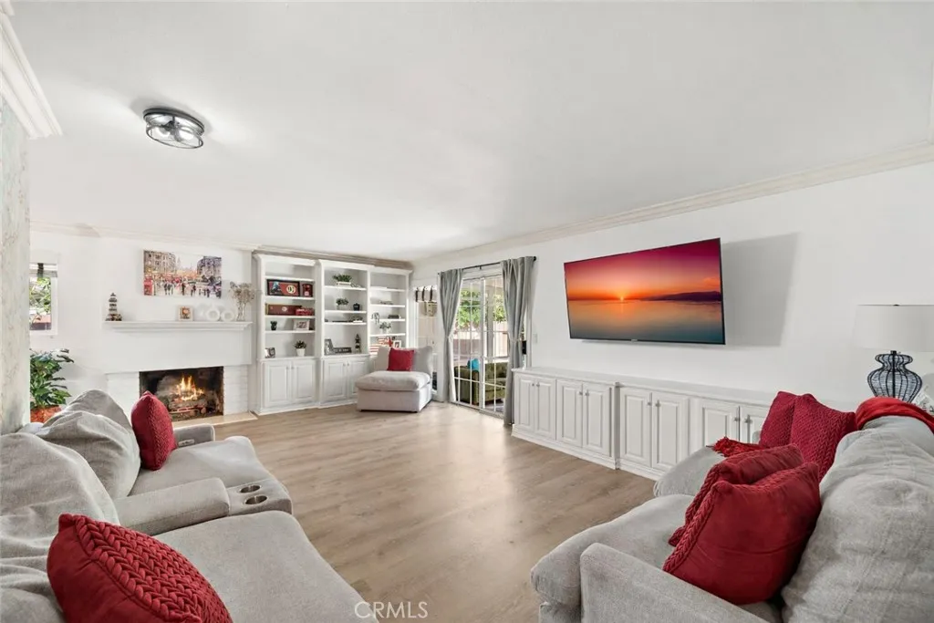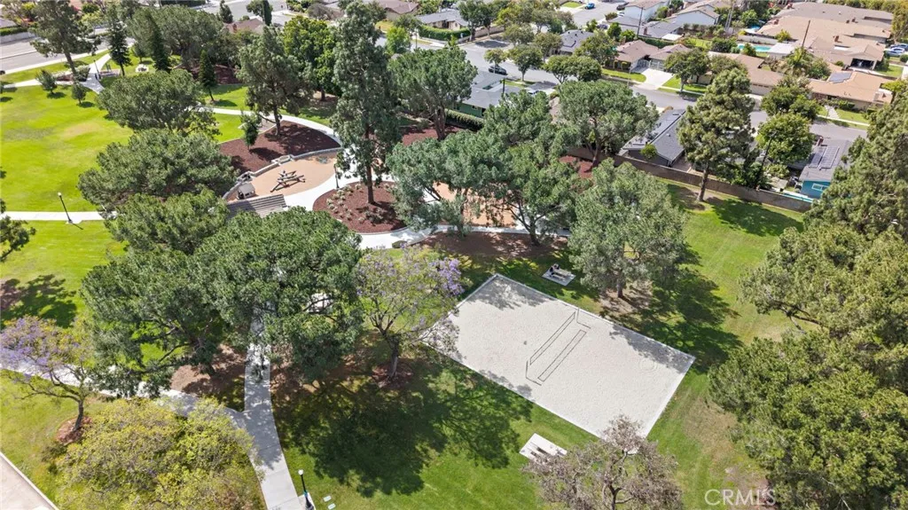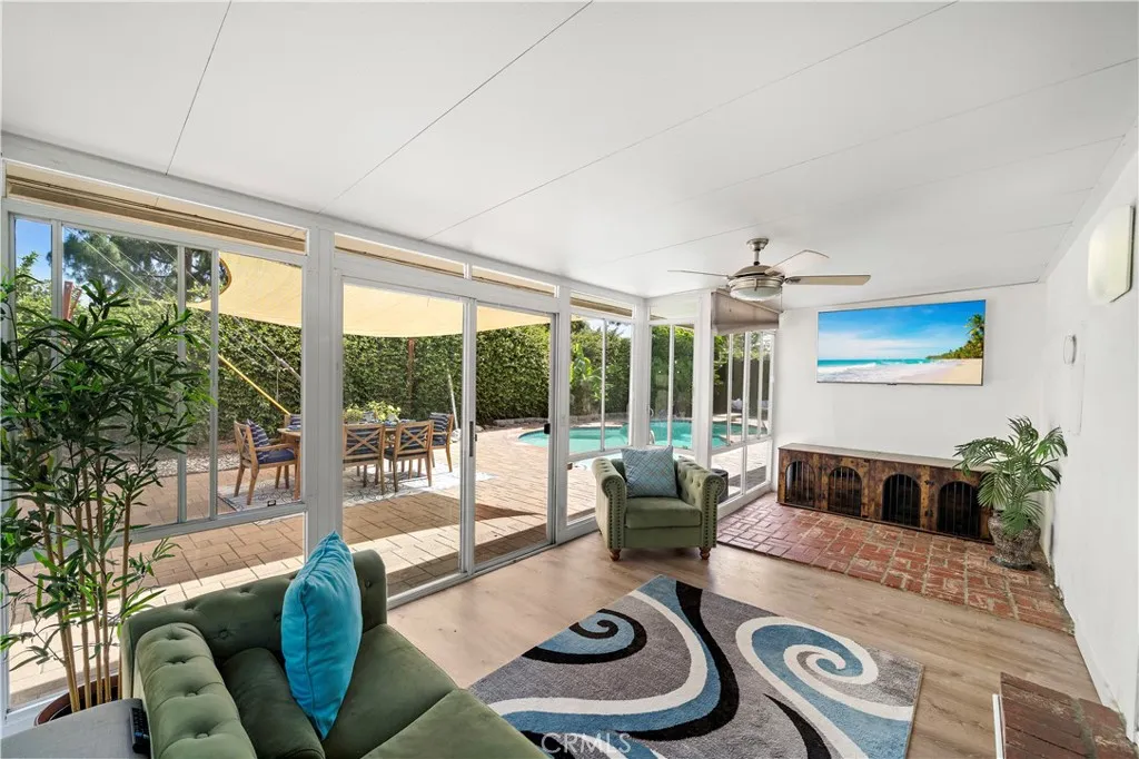 Ideally positioned in the heart of Tustin with quick access to shopping, dining, parks, and commuter routes, this beautifully designed single-level ranch-style home is tucked behind layers of mature landscaping and fencing that create a surprisingly private backyard retreat. Situated on an oversized 8,470 square foot corner lot that backs to the beautiful Pine Tree Park, this light-filled residence offers 4 bedrooms, 2 bathrooms, and over 1,700 square feet with wonderful flow for both everyday living and entertaining. A wide formal foyer welcomes you into the expansive wrap-around living room with fireplace, custom built-in entertainment cabinetry, and extensive built-in shelving, flowing seamlessly into the formal dining room and charming sunlit retro-style kitchen featuring a garden window, tile countertops, coffered ceiling with recessed lighting, white cabinetry with decorative niche shelving, and a breakfast bar. The home is beautifully appointed with wood laminate flooring, crown molding, raised panel interior doors, ceiling fans, central A/C, and a newer roof. French-style sliders open from the living room to a versatile sunroom (California room) that functions as additional indoor-outdoor living space, complete with TV hookups and walls of windows overlooking the spectacular backyard oasis. Designed for true Southern California living, the backyard feels like your own private resort with a sparkling pool featuring Baja-style coved seating, classic brick trim, and a diving board, surrounded by an expansive interlocking paver patio ideal for entertaining, outdoor dini